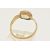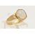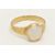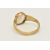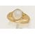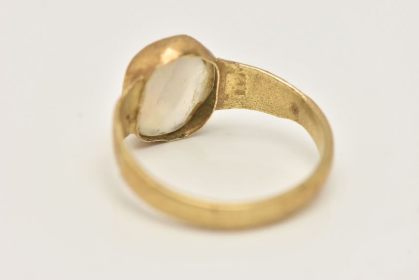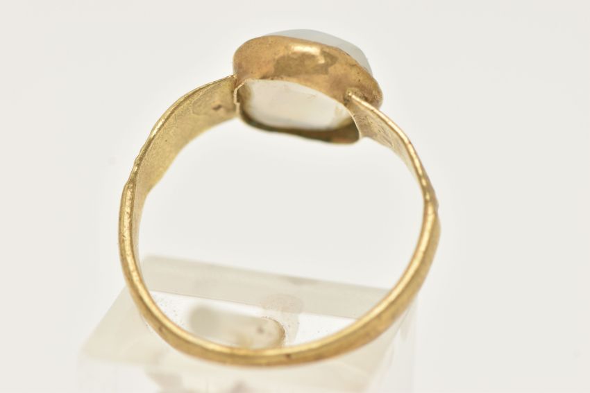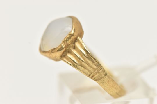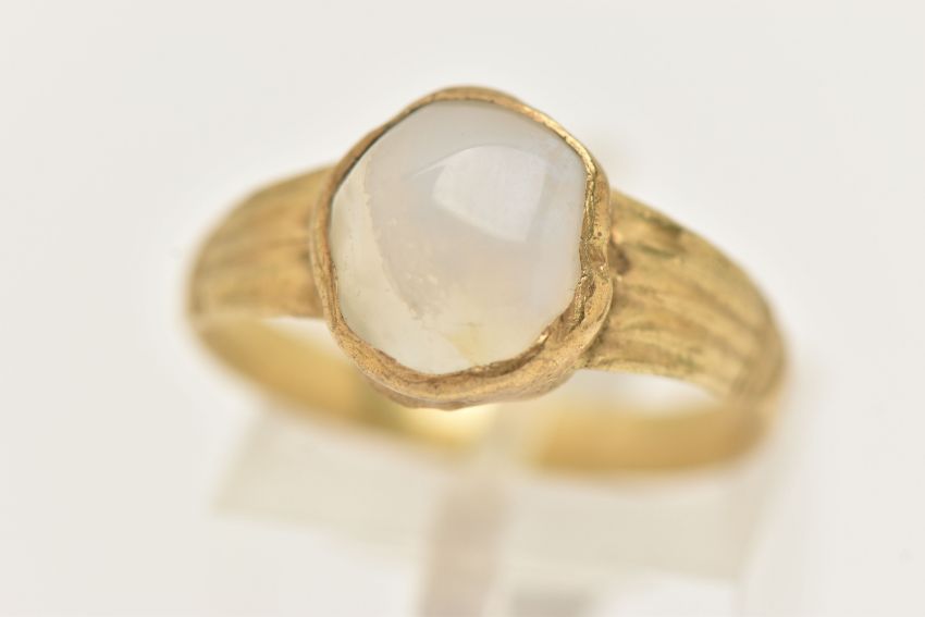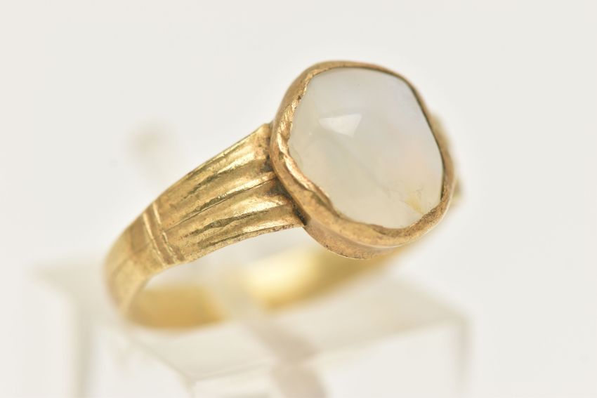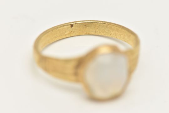 A YELLOW METAL QUARTZ RING, set with a quartz cabochon stone, rough collet set to textured shoulders and band, unmarked metal, ring size L, approximate gross weight 2.0 grams (condition report: roughly made, (possibly gold plated)(viewing is advised)