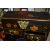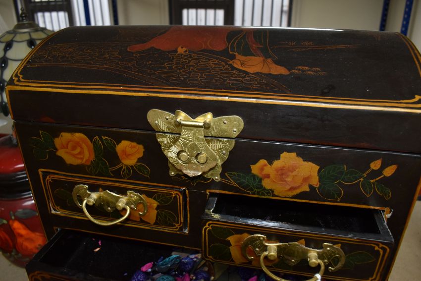 A MODERN ORIENTAL STYLE CABINET, decorated with transfer print peach coloured roses, a gilt metal butterfly clasp to secure the domed lid and three bat shaped handles to the drawers, height 47cm x width 36cm x depth 24cm (1) (Condition Report: missing both locks, chips to some edges and scratches to lacquered finish, one cupboard door does not close properly)
