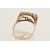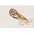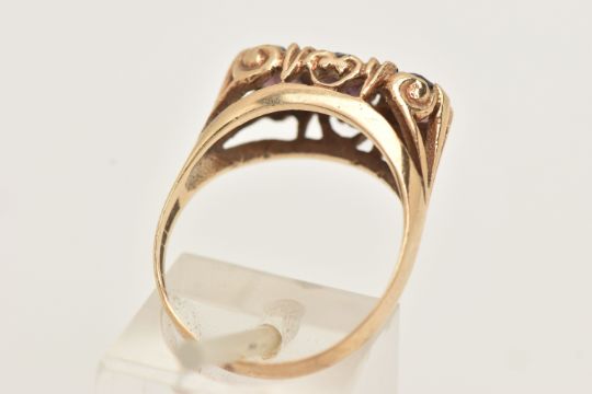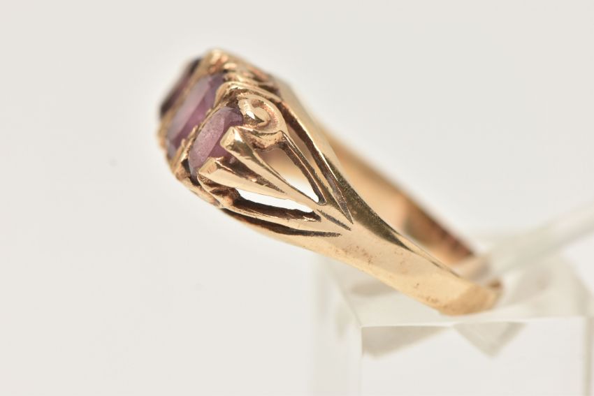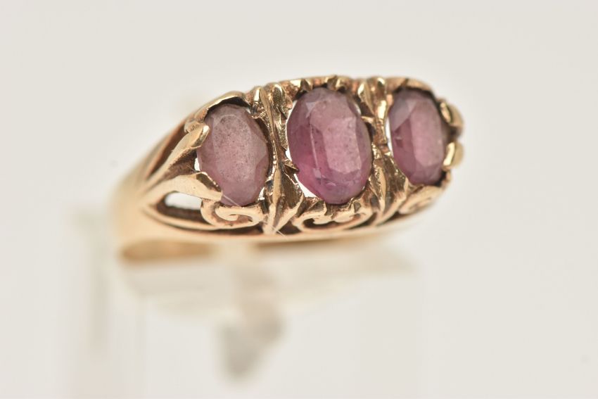A 9CT GOLD THREE STONE RING, set with three oval cut pink stones assesed as paste, to the scrolling gallery, and polished band, hallmarked 9ct Birmingham, ring size P 1/2, approximate gross weight 3.5 grams (condition report: would benefit from a gentle clean and polish, dirt build up, stones secure, overall condition good)