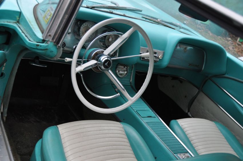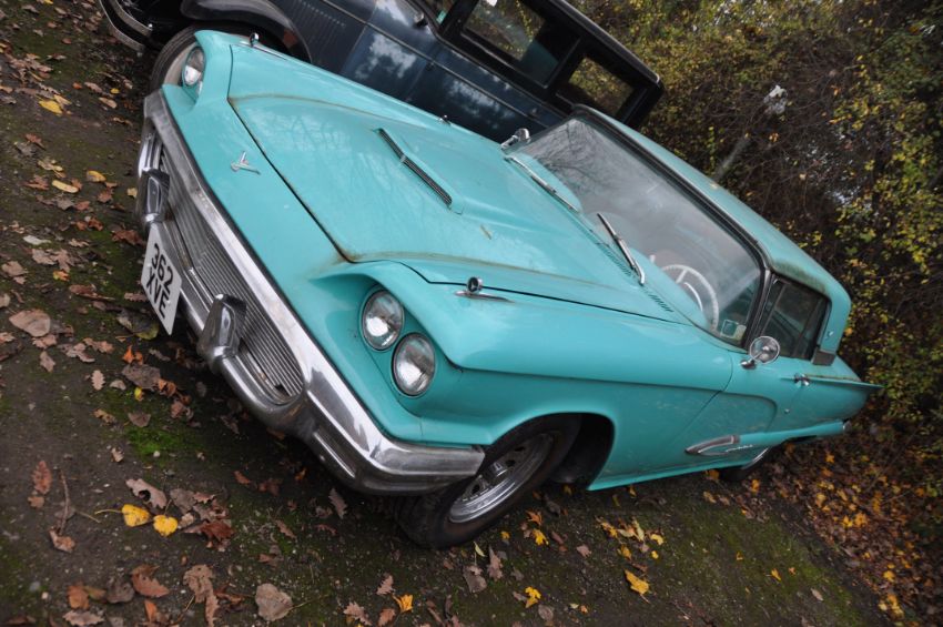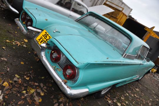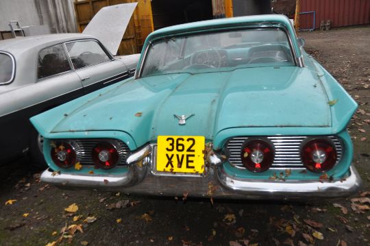 A 1959 FORD THUNDERBIRD TWO DOOR COUPE CAR, in turquoise and white with a 7038cc V8 petrol engine, column shift automatic gearbox, later four seat model with matching turquoise and white interior, V5C present, odometer 63,474 (unwarranted) 3 former UK keepers, first registered in USA 01/01/1959, first registered in UK 01/02/2019 under number plate 362 XVE, one set of keys, a folder containing US and UK receipts, import, shipping and registration documents (Condition Report: flat battery so engine and gearbox not tested, interior in very good condition, some bubbling and rust to bodywork, see pics for defects) (BUYERS PREMIUM IS CHARGED AT 10% + VAT PLUS ONLINE PLATFORM FEES)