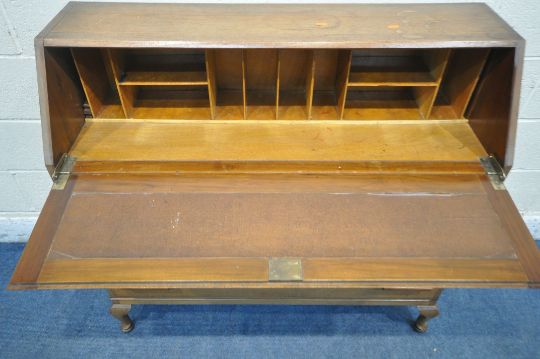 A 20TH CENTURY MAHOGANY BUREAU, the fall front door enclosing a fitted interior, above two short, over two long drawers, raised on cabriole legs, width 111cm x depth 42cm x height 102cm (condition report: marks, scuffs, stains, losses, discolouration, other wear and usage)