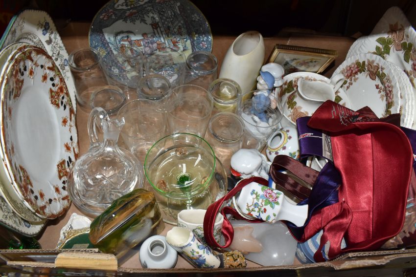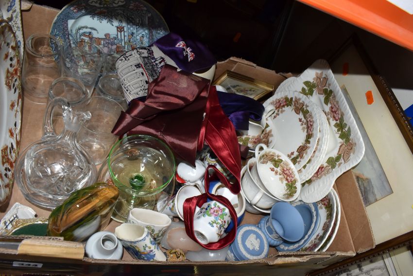 ONE BOX AND LOOSE CERAMICS AND DECORATIVE ITEMS to include a group of Wedgwood 'Wild Briar' tea wares comprising tea cups, saucers, side plates, a cake plate milk jug, and sugar bowl, three pieces of 'Jasperware' giftware, two leather bags of bowls, a Mason's 'Nangpo' plate and two matchstick holders in 'Regency' and 'Strathmore' patterns, a green vintage champagne coupe, three pictures (1 box and loose) (s.d)