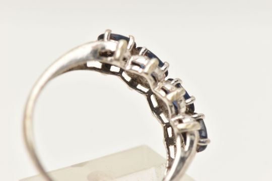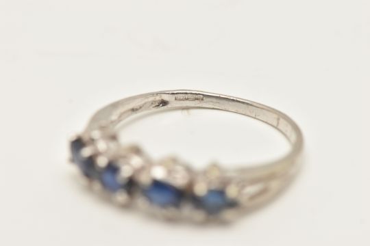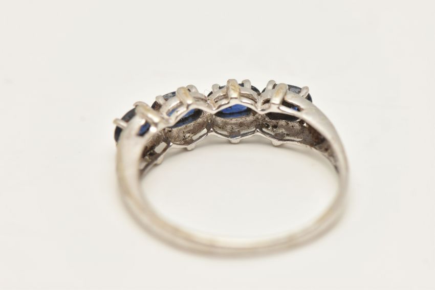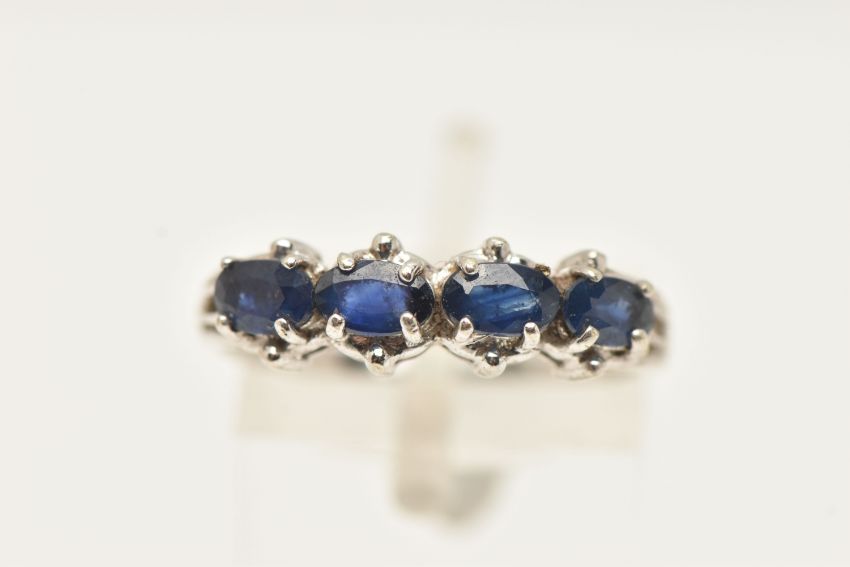 A 9CT WHITE GOLD SAPPHIRE RING, designed as a line of four oval claw set sapphires, 9ct hallmark, ring size N 1/2, approximate weight 2.3 grams (condition report: easily visible surface scratches to ring, would benefit from a clean, one claw broken)