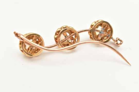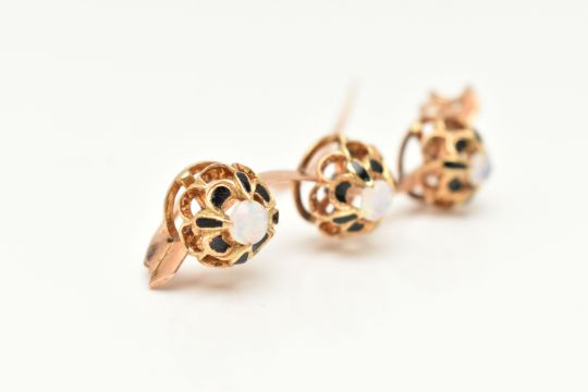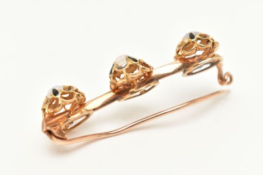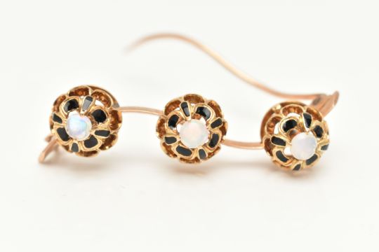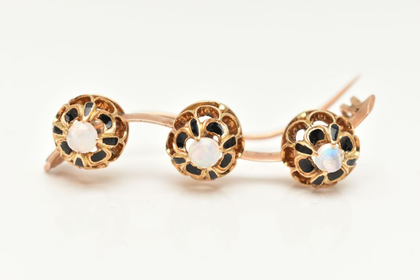 A YELLOW METAL OPAL BROOCH, possible conversion, wavy design set with three open work mounts each set with a central opal cabochon claw set with black enamel detail, to the open work scallop surround, mounted on a polished wavy bar, stamped possibly 15 partially under solder, fitted with a brooch pin and C clasp, length 47mm, approximate gross weight 7.6 grams (condition report: soft solder in places under mounts, general light wear)
