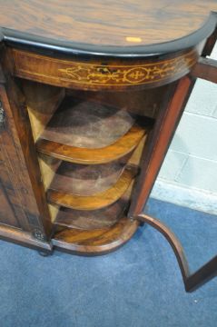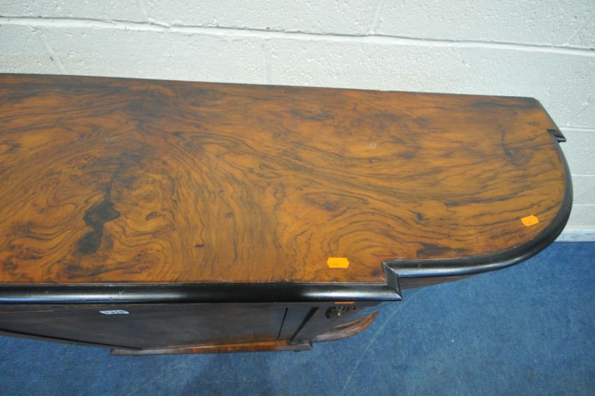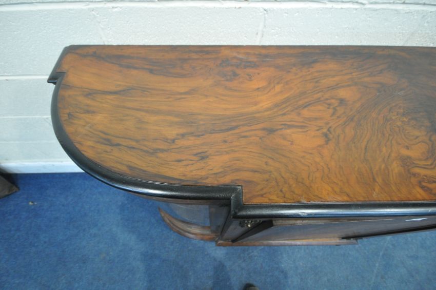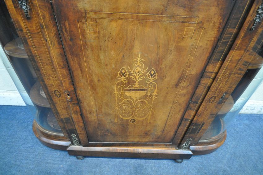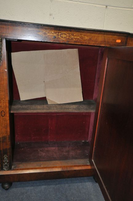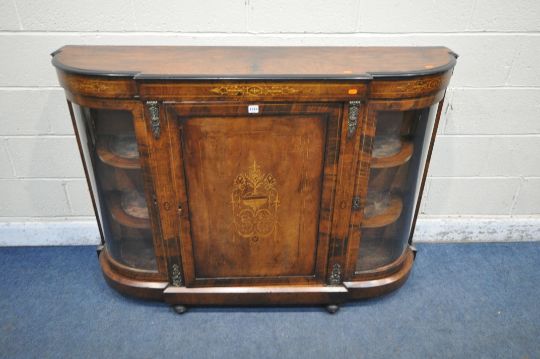 A VICTORIAN WALNUT CREDENZA, fitted with two glass doors, flanking a cupboard door, with marquetry inlay, raised on turned feet, length 148cm x depth 38cm x height 107cm (condition report: no key, historical marks, scuffs, other wear and usage)