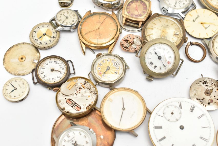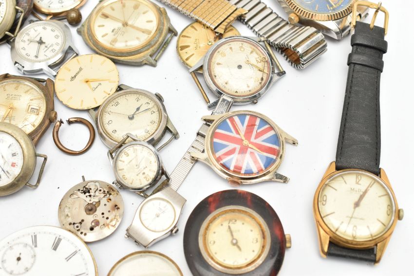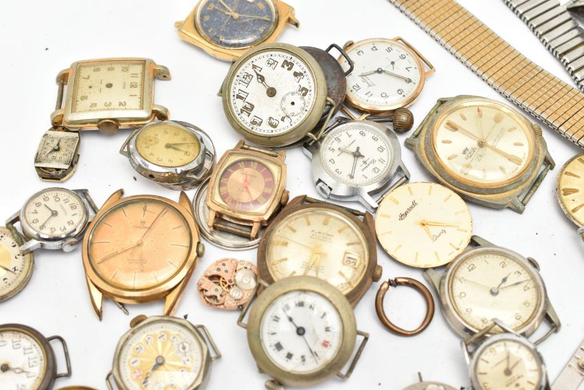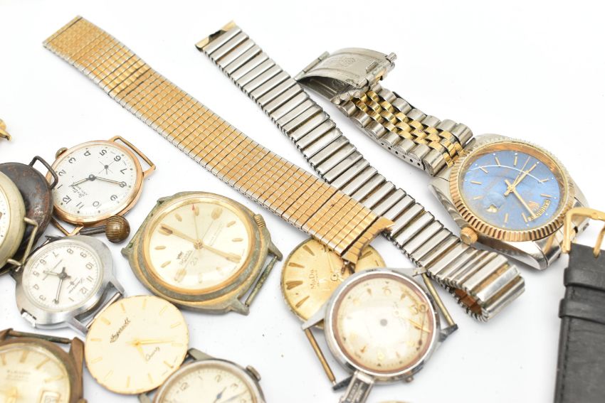 A BAG OF ASSORTED WRISTWATCHES AND WATCH PARTS, a variety of parts and watch heads names to include 'Mudu, Roma, Longines, Bentima, Seiko, Ingersoll, Onsa, Sekonda, Elroma' etc with a gold plated 'Zodiac' automatic watch head, watch bracelets, Perspex, movements etc (condition report: all pieces require attention, spares and repairs, we cannot guarantee the working order of any watch)