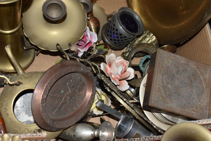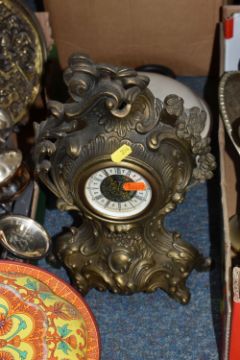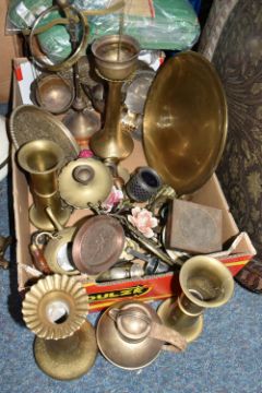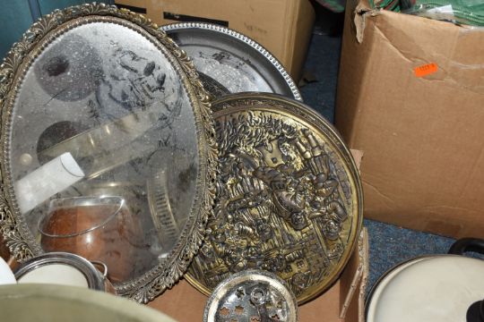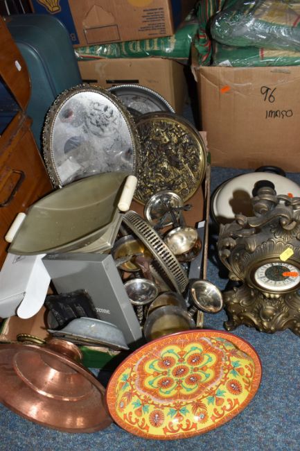 TWO BOXES AND LOOSE ASSORTED METALWARES to include a copper pedestal bowl, a group of Spanish plated goblets, a quantity of boxed Royal Limoges and Guy Degrenne cutlery, an art deco plated bowl with Bakelite handles, assorted Indian brass for international markets to include a pair of vases, a pair of ornamental scales, a large floral tinted tray, a lidded saucepan, and a standing clock (2 boxes and loose) (s.d)