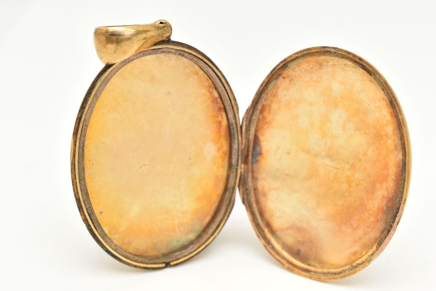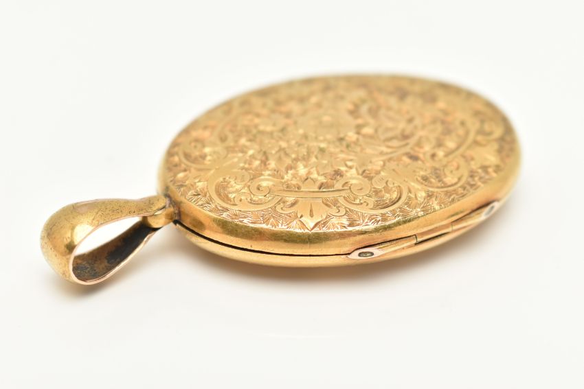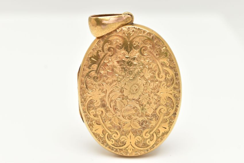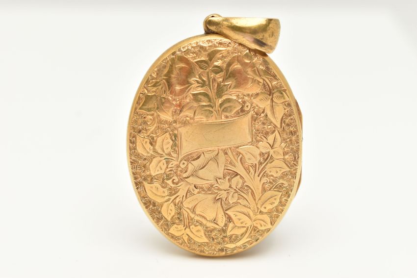 A LARGE YELLOW METAL OVAL LOCKET, detailed with a floral and ivy leaf pattern with vacant cartouche, fitted with a large tapered bail, opens to reveal two vacant compartments, missing glass/Perspex, unmarked metal, approximate length including bail 55mm, approximate gross weight 13.1 grams (condition report: general wear, some scratches to the bail, acid test mark to the inside, opens and closes flush)