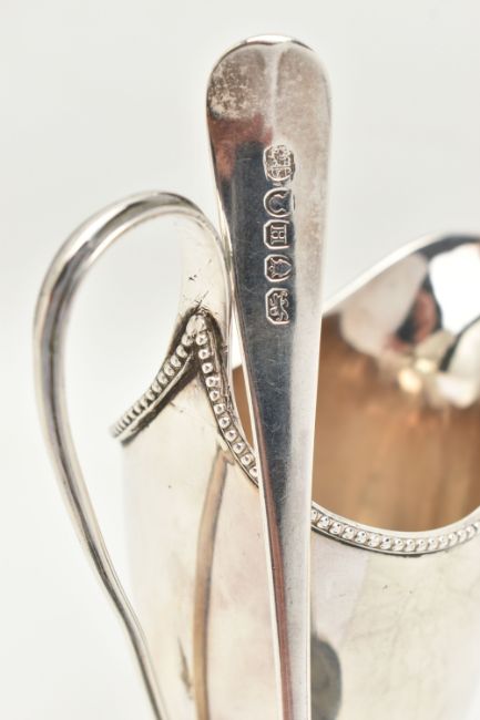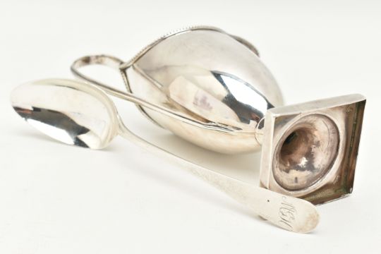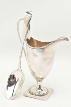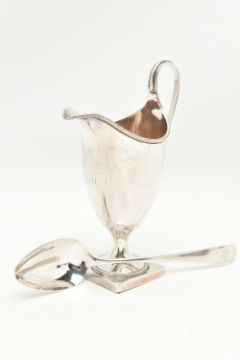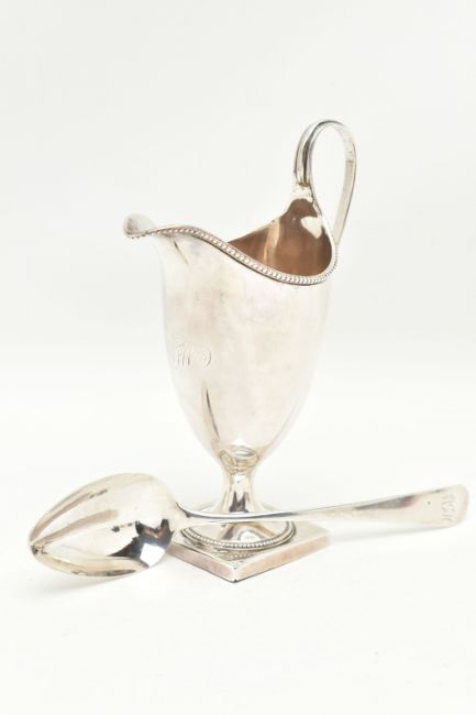 A GEORGE III SILVER CREAM JUG AND A SPOON, the jug of a polished form, beaded rim and engraved initials, fitted with a scroll handle, on a square polished base, hallmarked 'Hester Bateman' London 1785, approximate height including handle 15cm, together with an old English pattern spoon, engraved initials to the terminal, hallmarked 'Peter, Ann & William Bateman' London 1803, approximate gross weight 146.6 grams, 4.71 ozt (condition report: general light wear, base of the jug slightly indented with a slight wobble, handle has a dent, the bowl of the spoon has a dent to the rim)