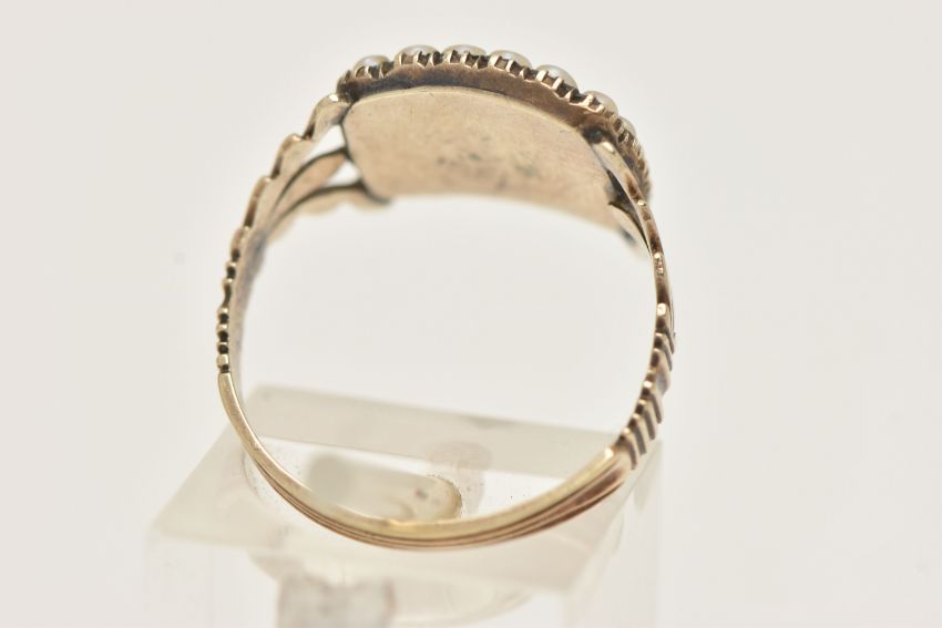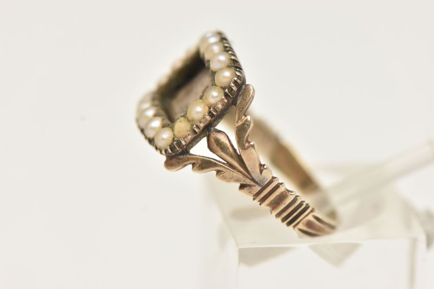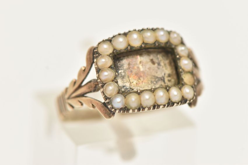 A YELLOW METAL SPLIT PEARL MOURNING RING, of a rectangular form with vacant compartment missing glass cover, to a surround of small split pearls (one missing), trifurcated foliate pattern shoulders and textured band, unmarked metal, ring size N, approximate gross weight 2.1 grams (condition report: requires some attention, general wear, discolouration to the vacant compartment, one pearl is missing, metal has not been tested, viewing is advised)