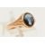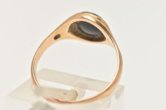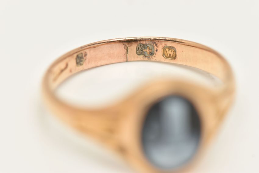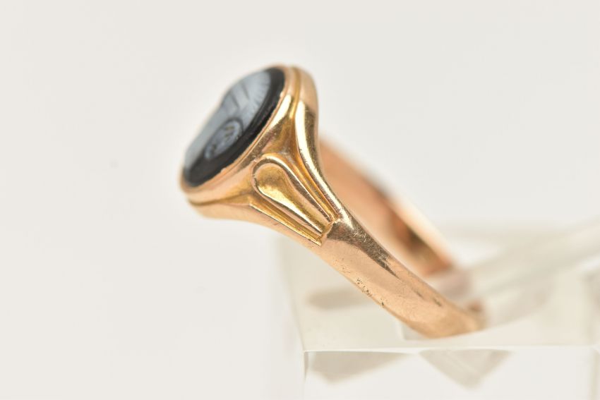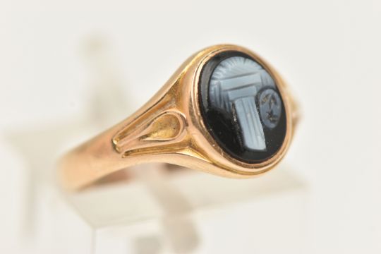 A YELLOW METAL SARDONYX RING, of an oval form with a black and white sardonyx cameo, collet set to the textured shoulders and polished band, ring size J 1/2, part Birmingham hallmark, approximate gross weight 2.3 grams (condition report: previous ring size alteration visible to the band which has affected the hallmark, general wear)