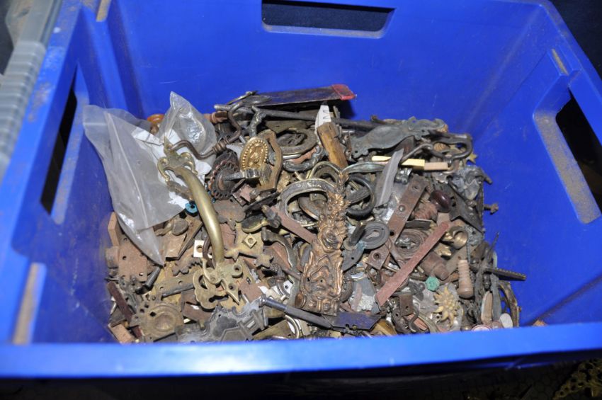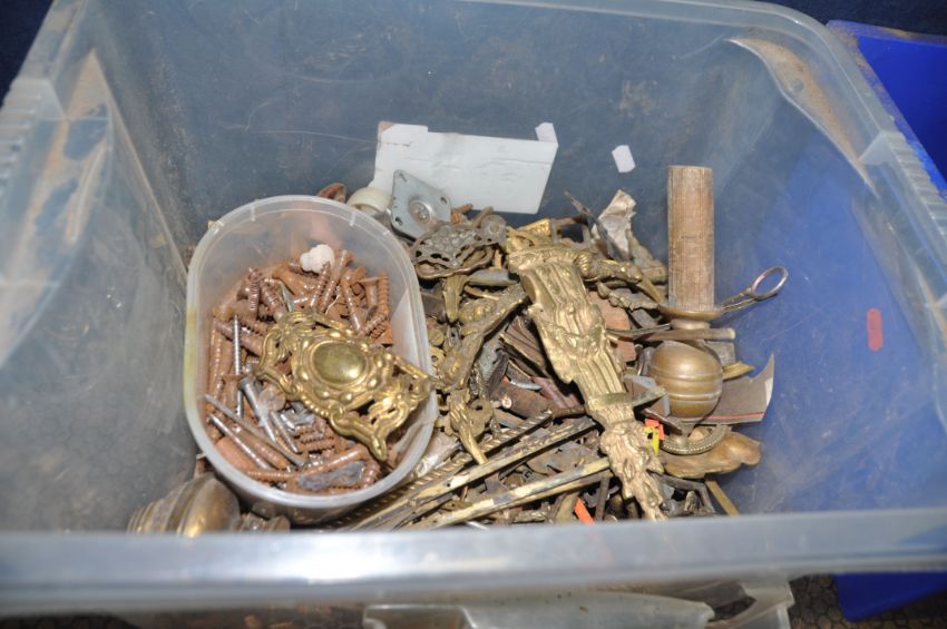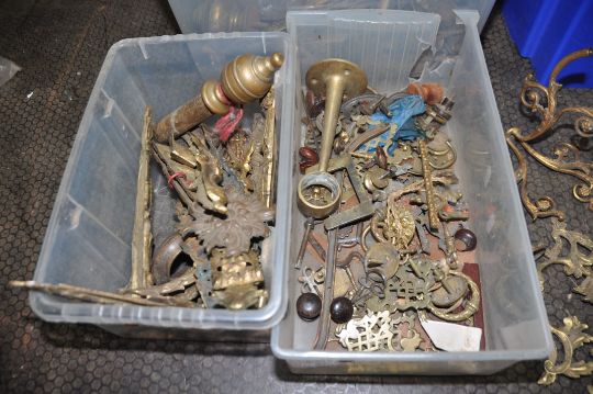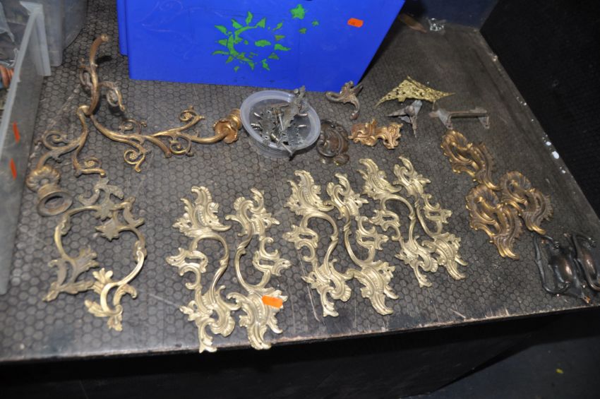 FOUR TRAYS CONTAINING FURNITURE ADORNMENTS, including early 20th century and earlier Ormolu and Rococo handles, corners, strips, escutcheon, etc