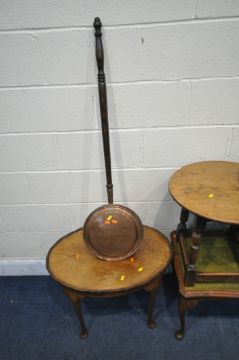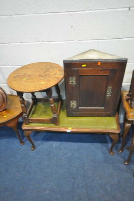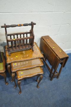 A WALNUT OVAL OCCASIONAL TABLE, a rectangular coffee table, a walnut nest of three tables, a drop leaf table, a magazine rack, a corner cupboard, an oak circular table, and a copper bed pan (condition report: all with marks, scuffs, stains, discolouration, other wear and usage) (8)