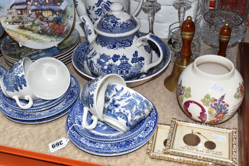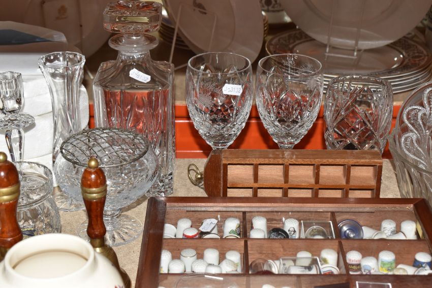A GROUP OF CERAMICS, GLASS AND SUNDRY ITEMS, to include a collection of thimbles with display cases, thimbles to include Disney, commemorative, souvenir and advertising examples, a silver thimble stamped 925 depicting a dog, a Willow pattern tea/coffee 'set' by Broadhurst, English Ironstone and Churchill, comprising a teapot, a coffee pot, a milk jug, a sugar bowl, seven tea plates, six teacups and six saucers, together with a serving bowl and four cereal bowls, twelve collectors plates, two small brass hand bells, cut crystal including a Royal Brierley preserve pot and a pair of Nachtmann candlesticks, etc (qty) (Condition Report: most pieces appear in good condition, sd)