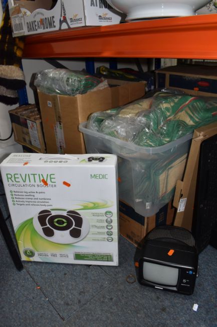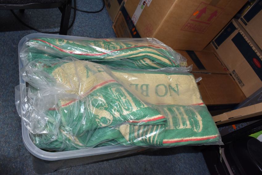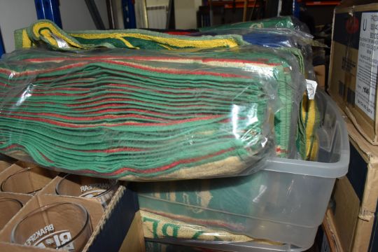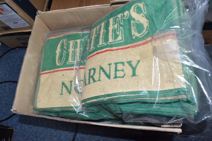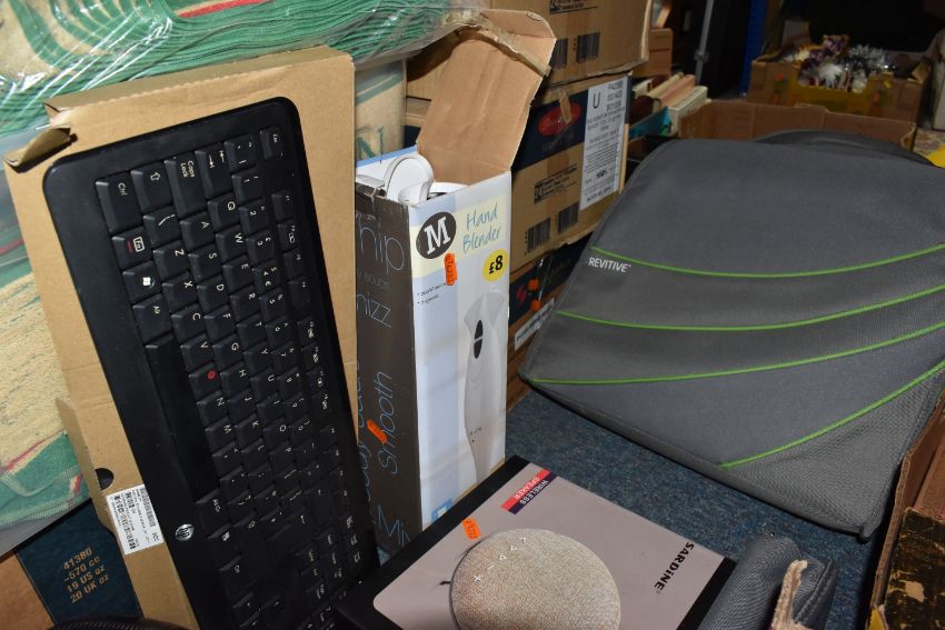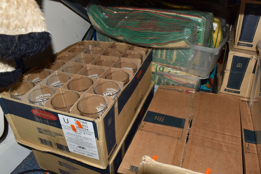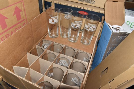 ELEVEN BOXES AND LOOSE BREWERIANA AND ELECTRICAL ITEMS, to include seven boxes of twenty four Brakspear Black pint glasses, a quantity of Christie's bar towels, and various electrical items including a boxed HP keyboard, a boxed Medic Revitive circulation booster, with accessories and a boxed Sardine wireless speaker (11 boxes + loose) (sd, electricals untested)