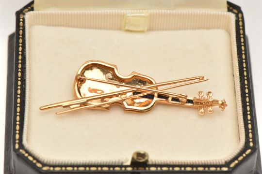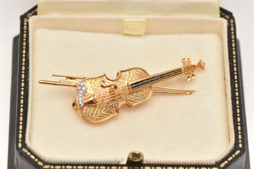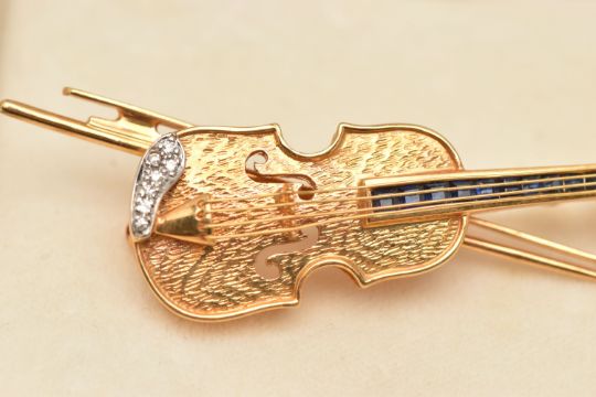 AN 18CT GOLD VIOLIN BROOCH PENDANT, a yellow gold novelty brooch designed as a violin with a bow, with a white gold chinrest embellished with seven round brilliant cut diamonds, calibre cut blue spinel channel set behind the strings, approximate length 58mm, hallmarked 'CLM' 18ct Birmingham import 1991, approximate gross weight 9.4 grams (condition report: general light wear, all stones intact, overall condition good)
