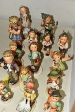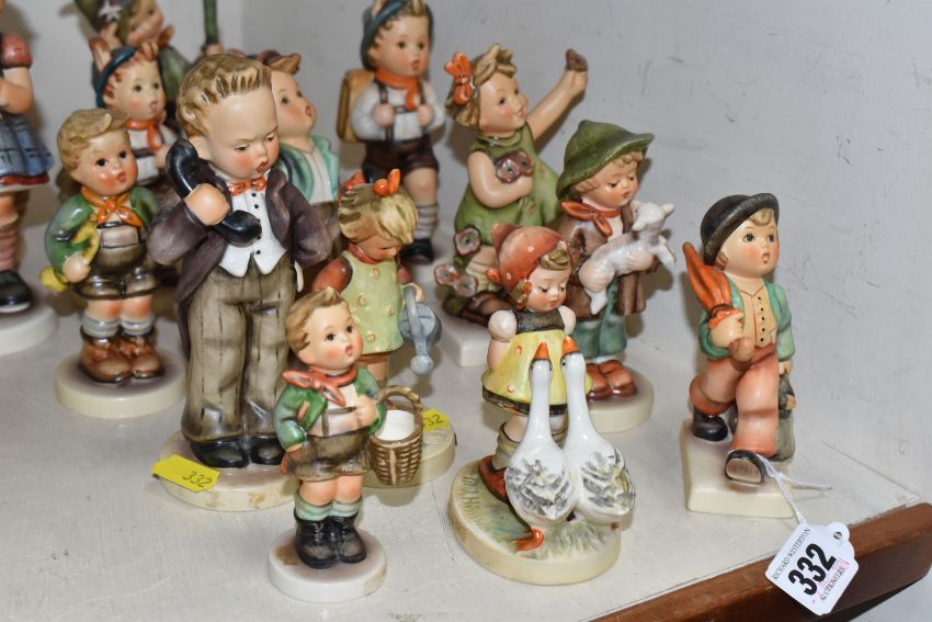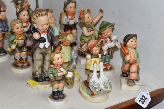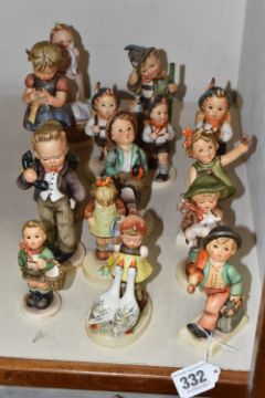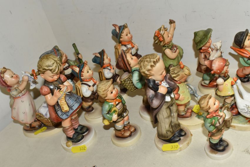 A GROUP OF FIFTEEN HUMMEL FIGURES BY W. GOEBEL to include 'Merry Wanderer' 112/09, 'Goose Girl' 473/0, 'Village Boy' 513/0, 'The Lost Sheep' 68/2/0, 'Little Gardener' 74 (small scratch the back), 'Hello' 124/0, 'Spring Cheer' 72 (some crazing), 'Globe Trotter' 79, three different sizes of 'School Boy' marked 822/, 82/0, 82 2/0, 'Trumpet Boy' 97, 'Mountaineer' 315, 'A Stitch in Time' 255, and 'Wash Day' 321, (15) (Condition Report: some items have minor crazing to the bases, but overall fair condition, height of tallest 17cm)