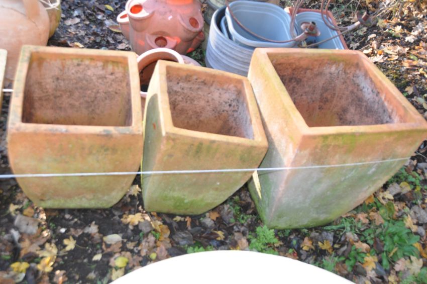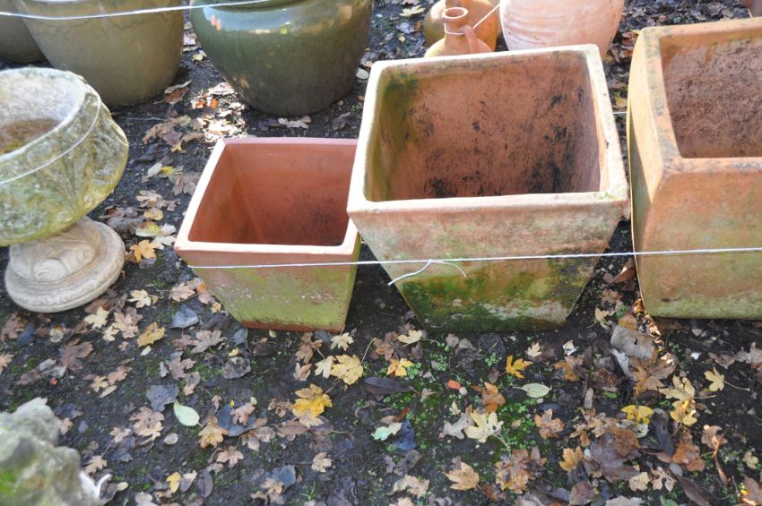 A COLLECTION OF TERRACOTTA COLOURED LARGE PLANT POTS including three square tapering baluster pots of two different sizes, the largest being 58cm high, etc (5)