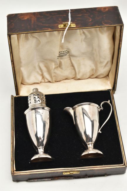 A GEORGE V CASED MILK JUG AND SUGAR CASTER SET, plain polished design with C scroll handle, hallmarked 'Adie Brothers Ltd' Birmingham 1938, approximate gross weight 136.8 grams, 4.40 ozt, (condition report: case damaged, indenting to the base of both items)