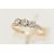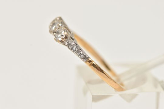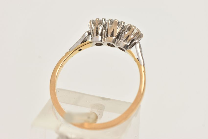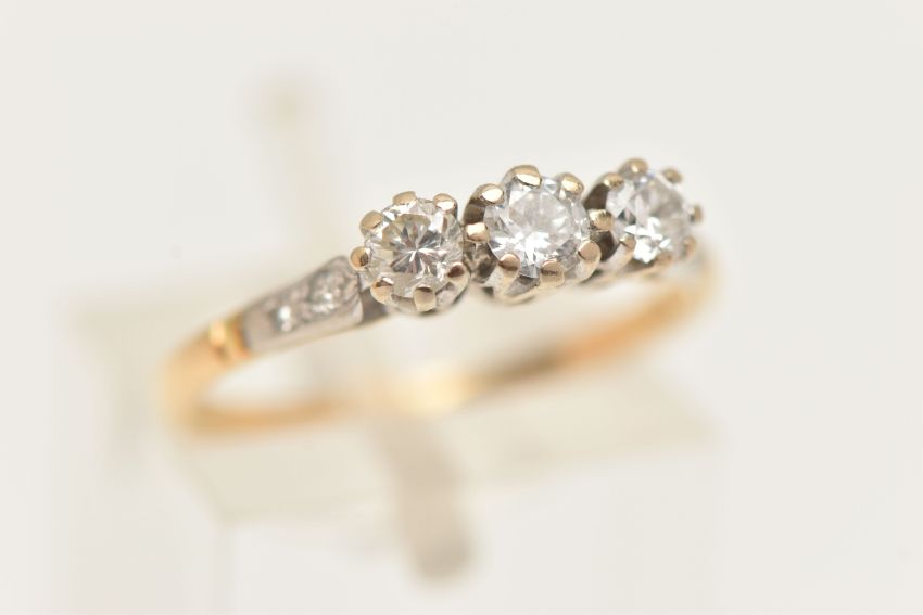 A WHITE AND YELLOW METAL DIAMOND THREE STONE RING, set with slightly graduating round brilliant cut diamonds, the central diamond measuring approx. 3.4mm diameter (depth approx. 1.79mm), the side diamonds measuring approx. 3.1mm diameter (depth approx. 2.02mm) and approx. 3.1mm diameter (depth approx. 1.89mm), six claw set, each shoulder set with two single cut diamonds, to the plain band, estimated total diamond weight of the three principal diamonds 0.34cts, assessed colour G-H, assessed clarity VS-I1 (one diamond chipped), stamped 18ct, ring size L 1/2, approximate gross weight 2.33 grams (condition report: overall condition very good, diamonds well matched and appear bright and lively, one diamond chipped under one claw)