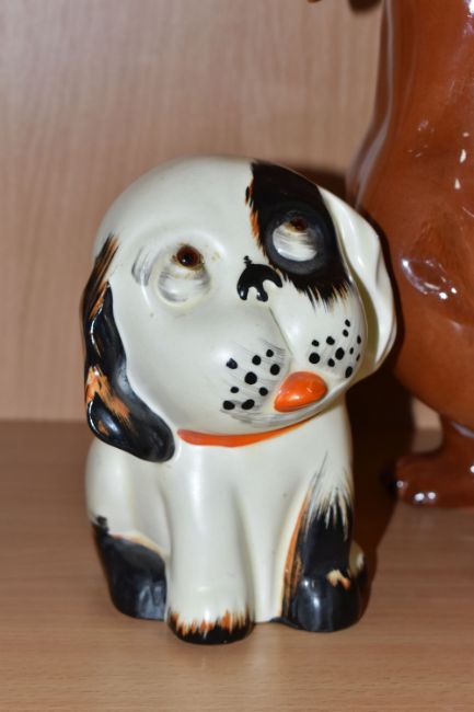 THREE CERAMIC FIGURES, comprising a Beswick tan Fireside Model Dachshund model no 2286, height 26.5cm, a Beswick 'Merlin' Beneagles whisky decanter no 2641 (glazed over loss to beak), and a Crown Devon Bonzo dog figure, with original foil sticker, height 13cm (light crazing, left eye broken/deliberately cut to fit?) (3) (Condition Report: specific obvious damage as stated, otherwise pieces appear ok)