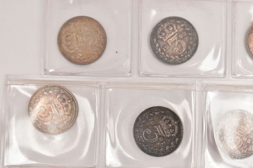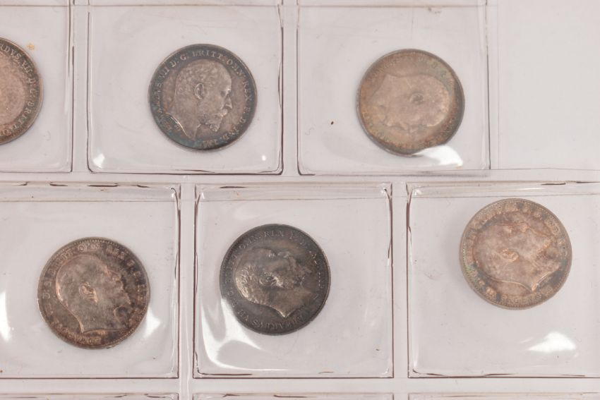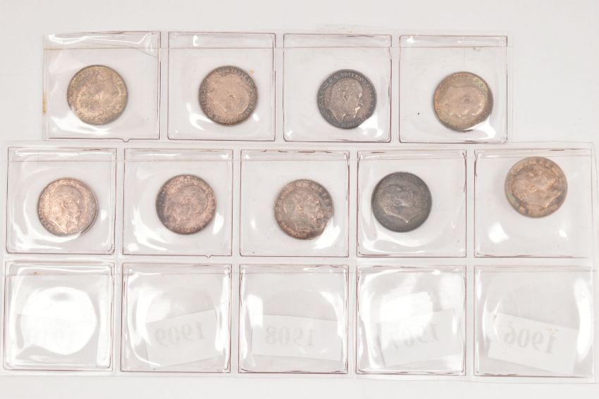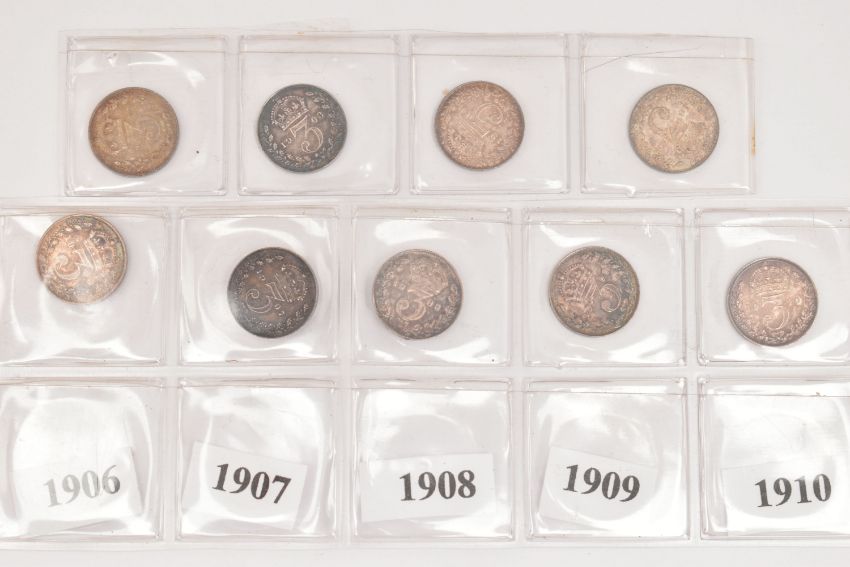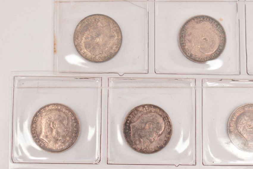 A DATE RUN OF EDWARD VII THREE PENCE 3d COINS 1902-1910 with some high grades (9)