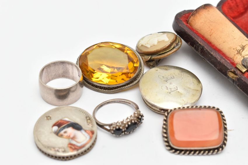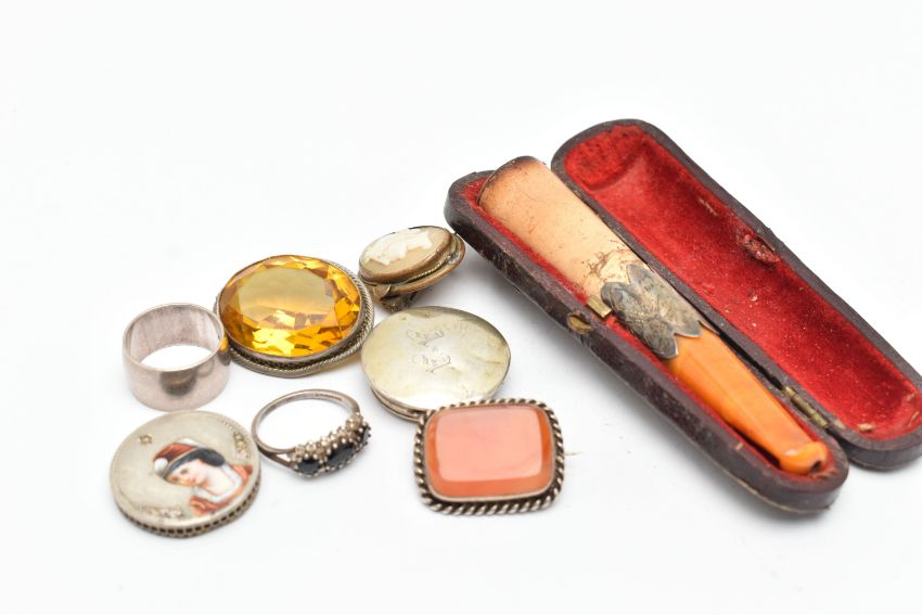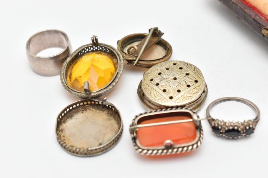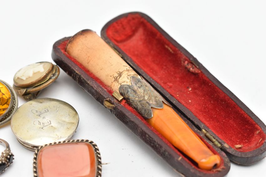 A SMALL ASSORTMENT OF ANTIQUE JEWELLERY AND ITEMS, to include a cased amber and silver mounted cheroot, hallmarked 'W H Carrington & Co' Chester, a silver polished wide band, hallmarked Birmingham, a white metal carnelian set brooch, a white metal yellow paste set brooch AF, an enamel ad split pearl set case back possibly, a white metal cluster ring, a cameo brooch etc