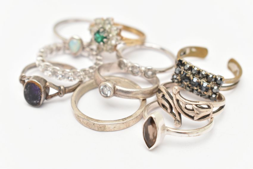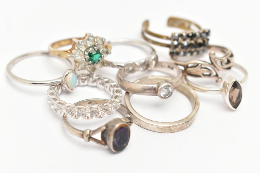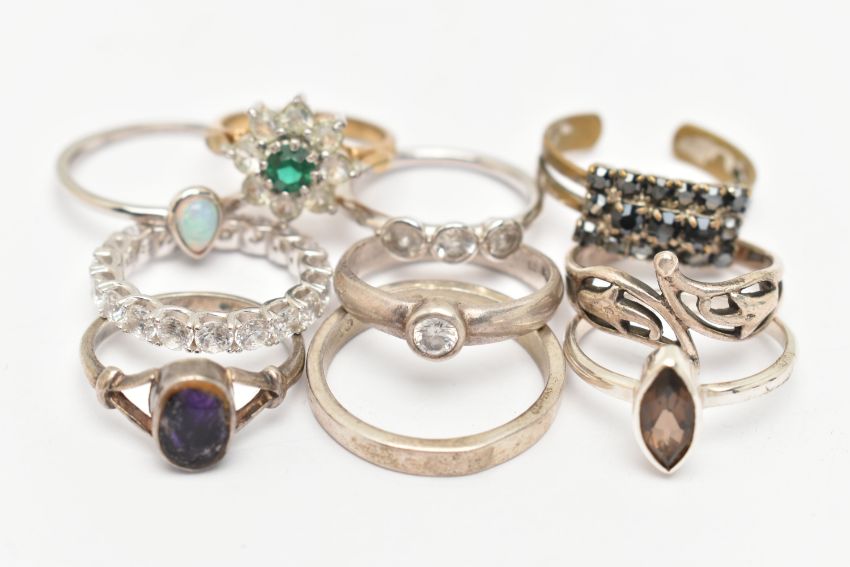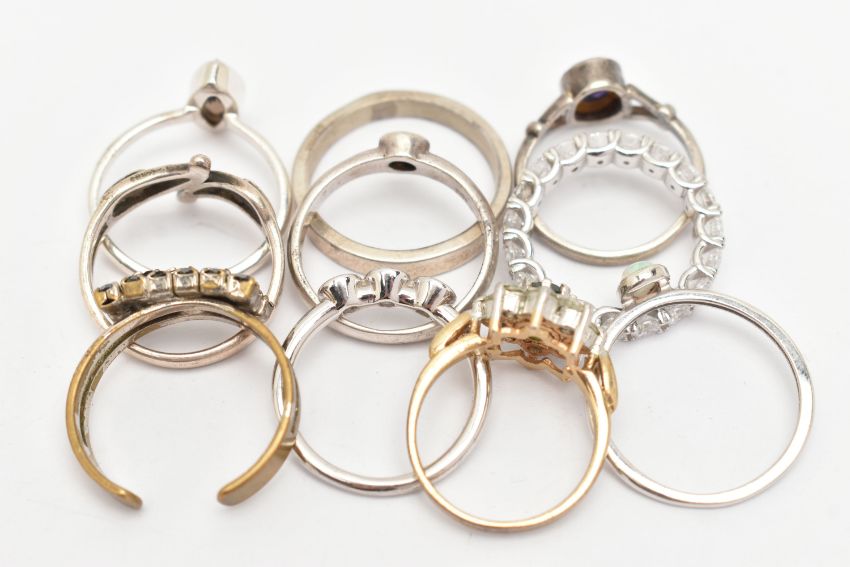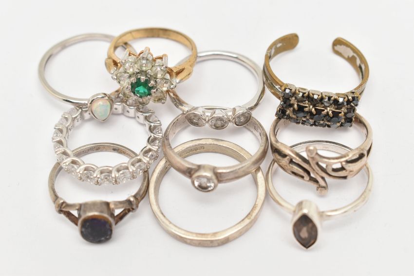 AN ASSORTMENT OF TEN RINGS, to include a silver band ring, hallmarked Edinburgh, ring size R, approximate gross weight 3.2 grams, seven white metal rings, stamped 925 or silver, approximate gross weight 15.8 grams, together with two costume jewellery rings (condition report: general moderate wear, overall condition good)