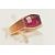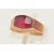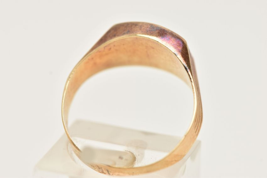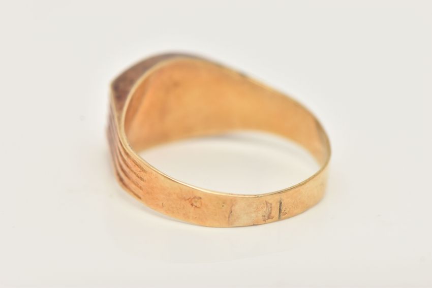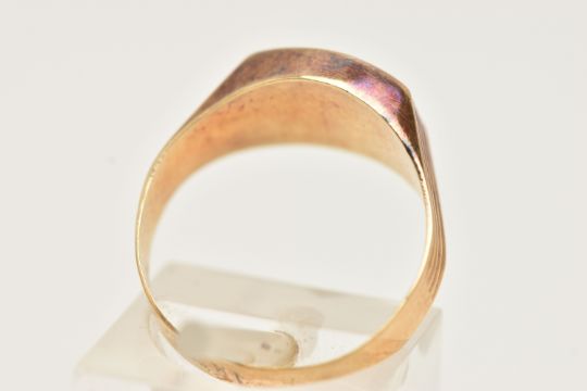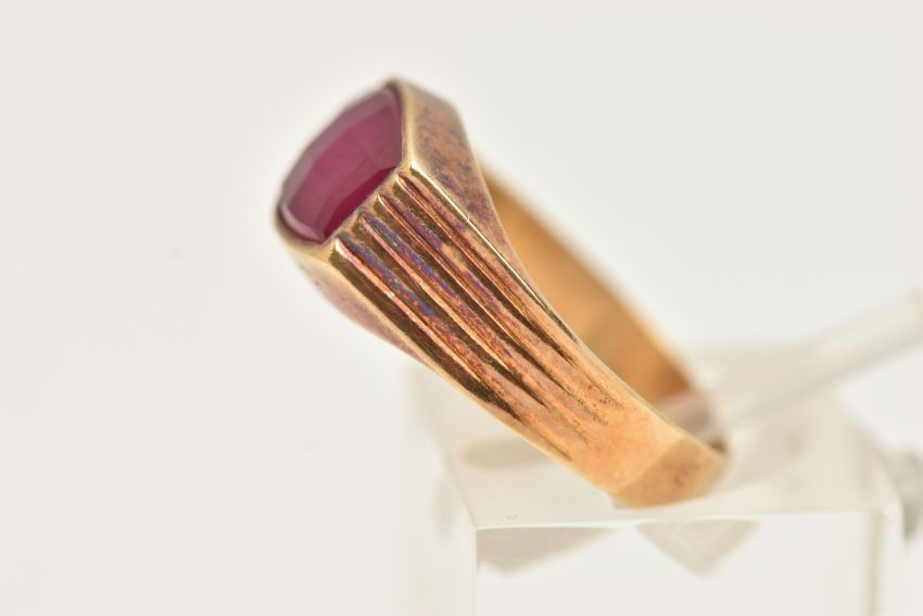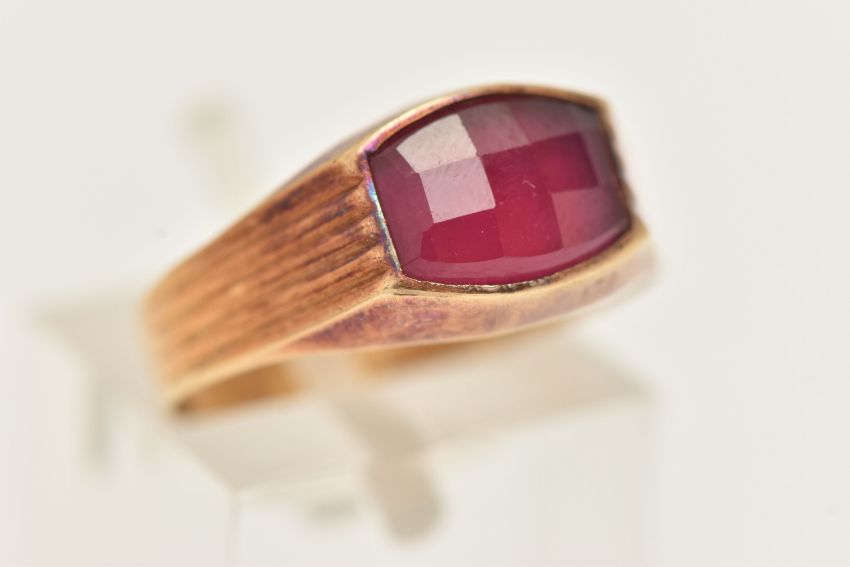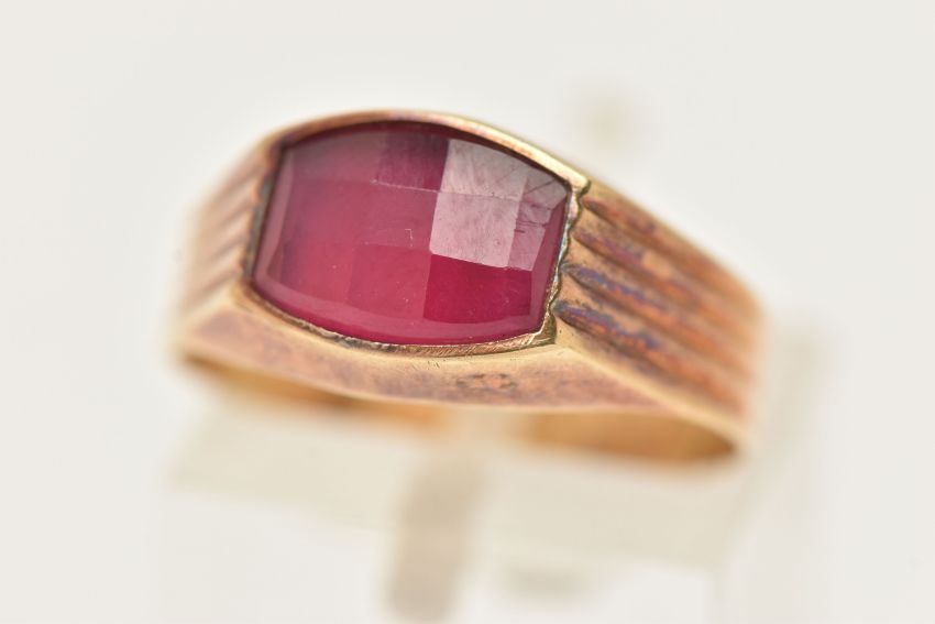 A YELLOW METAL FANCY CUT RUBY RING, ruby collet set to the textured shoulders and polished band, rubbed unclear mark to the outer band, ring size N, approximate gross weight 2.1 grams (condition report: previous ring size alteration visible, slight discolouration to the metal, viewing is advised, ruby possibly synthetic)