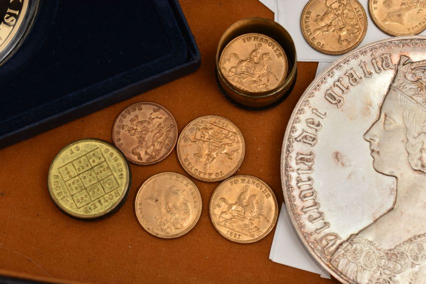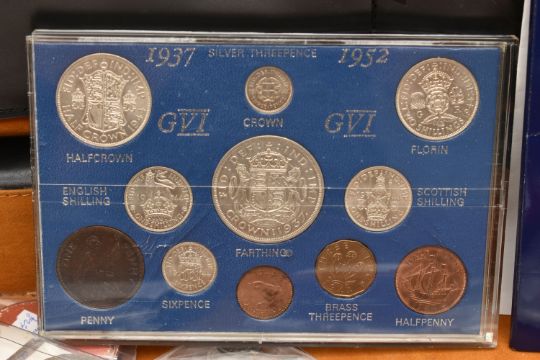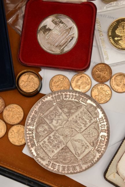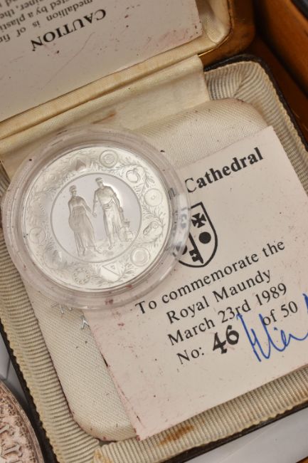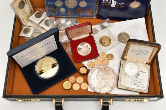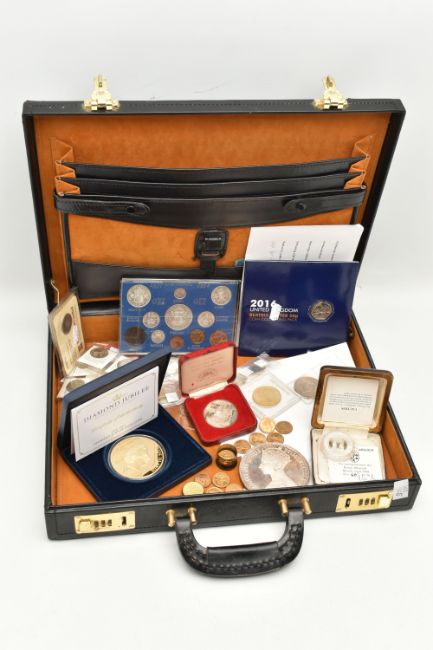 A COMBINATION BRIEFCASE CONTAINING AMOUNTS OF COIN MEDALS and COMMEMORATIVES, to include a proof Maundy Medallion to Commemorate The Royal Maundy Service at Birmingham Cathedral 23rd March 1989 (46 of 50), a Southwell Minster 1984 Royal Maundy Sterling Silver Medallion, a George VI uncirculated year set of coins 1944 The Crown Coin 1937 (11 coins), a 2016 change checker, Beatrix Potter 5x 50p sealed set, 2x HIS 1666 tokens, replica coins, an 1862 French Medal for the London exhibition showing Queen Victoria in period case, a most beautiful 30mm Whist tin and contents containing 16x To Hanover high grade tokens, a 2015 Royal Mint Trial £1 Piece, 1955, 1951 uncirculated pair brass 3d coins, a 388 gram white metal Gothic Crown copy featuring Queen Victoria etc