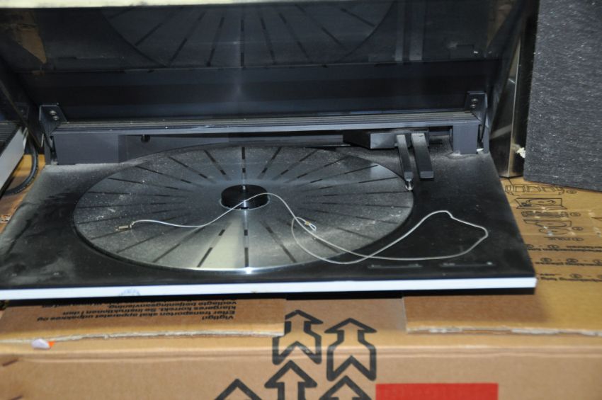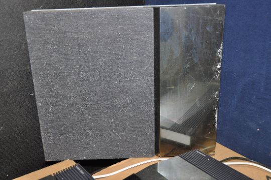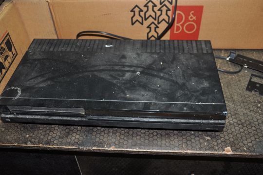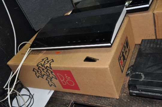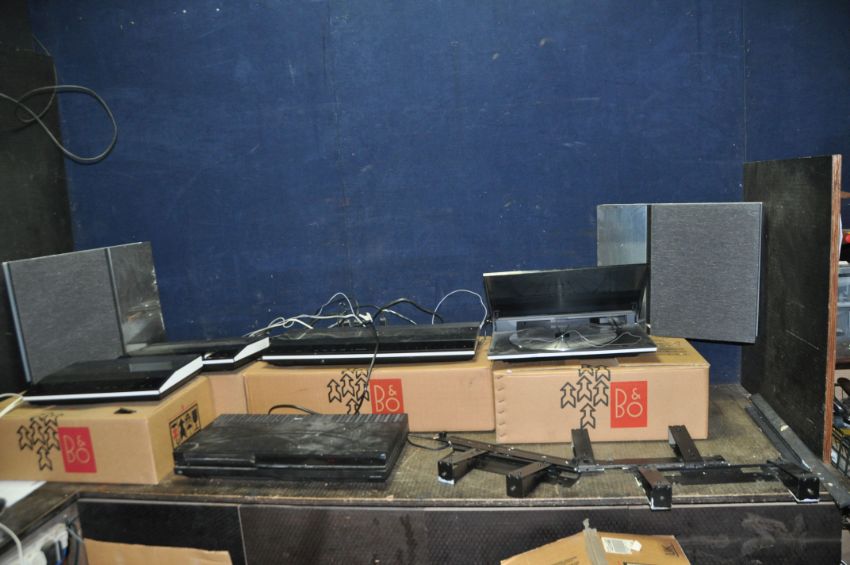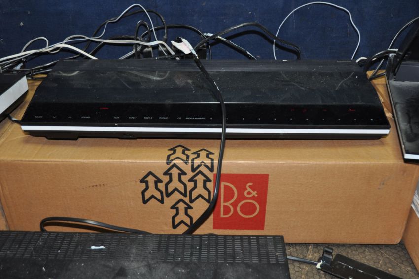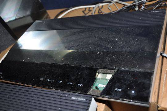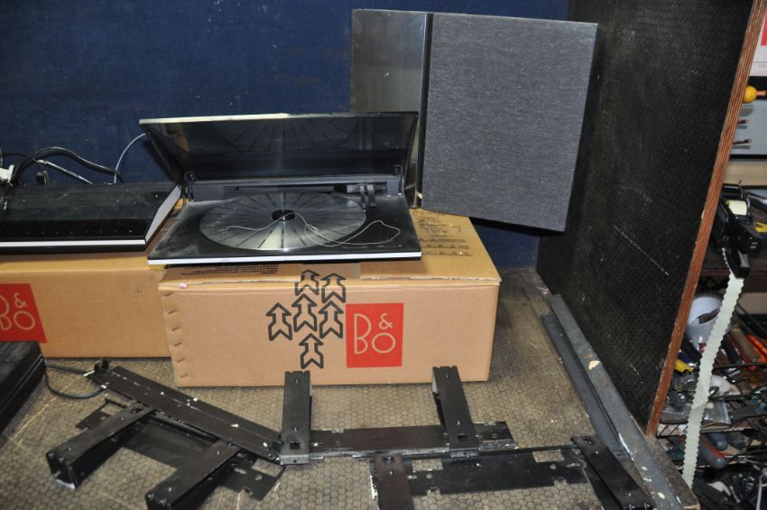 A BANG AND OLUFSEN 4500 HI FI SYSTEM comprising of a Beogram with a MMC2 cartridge (linear tracking arm drive wire not fitted but present, tracks record until arm needs to move), a Beomaster, a Beogram CD, a Beocord (broken control panel so controls DO NOT WORK but powers up, a VX7000 VHS player (chews tapes but powers up), a pair of Beovox 4500 6726 speaker in grey (working) with hanging brackets and Beovox 1001 empty box and packaging) ALL WITH ORIGINAL BOXES AND PACKAGING Condition Report: paint and wallpaper stripping to most, all dirty and need cleaning