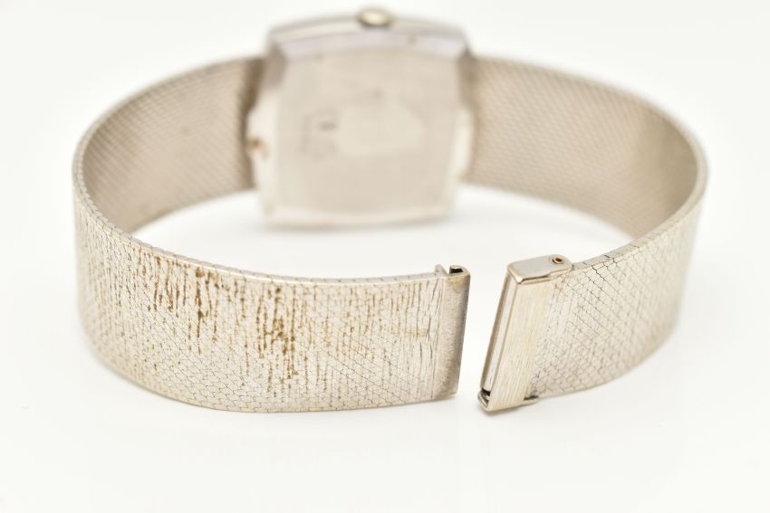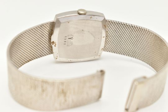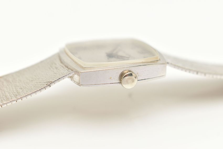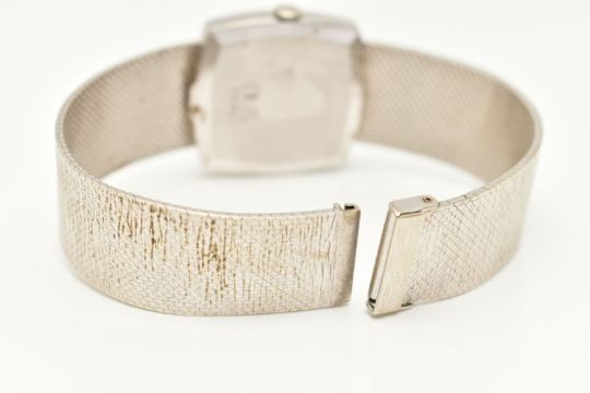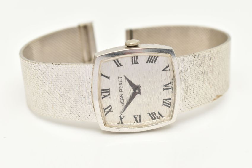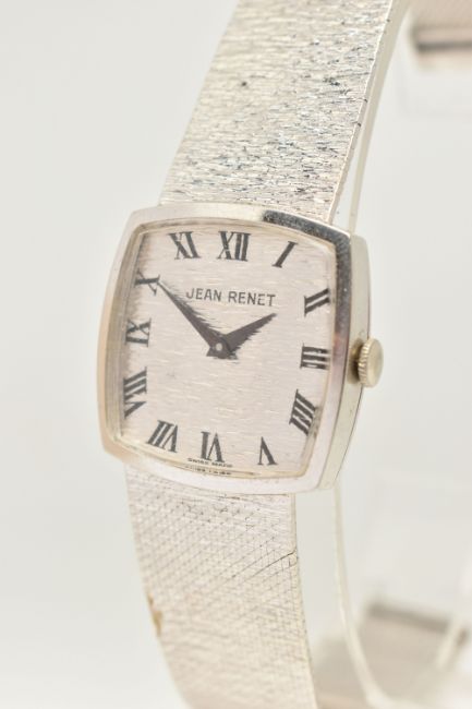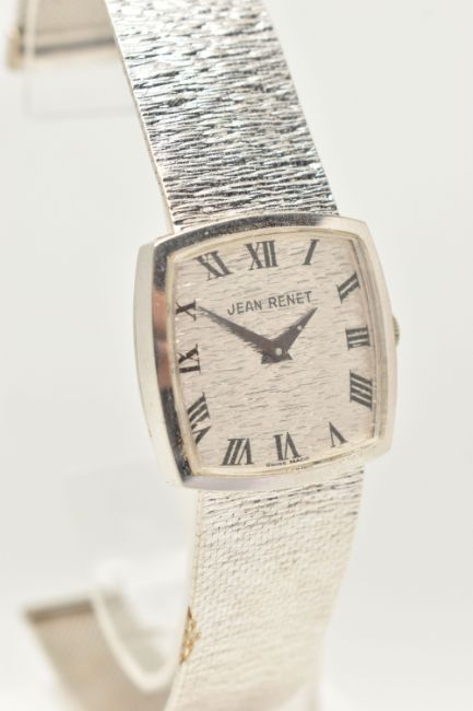 A LADIES 9CT WHITE GOLD 'JEAN-RENET' WRISTWATCH, manual wind movement, rounded square textured dial signed 'Jean-Renet', Roman numerals, polished case, outer case stamped 9k 0.375, numbered 173, 1980, Swiss control marks, inside case back hallmarked 9ct London import 1971, approximate case width 26.5mm, approximate gross weight excluding movement 38.7 grams, together with a watch box (condition report: watch winds, sets and runs at time of cataloguing although time keeping is untested, general light wear, clasp in working order, we cannot guarantee the working order of any watch)