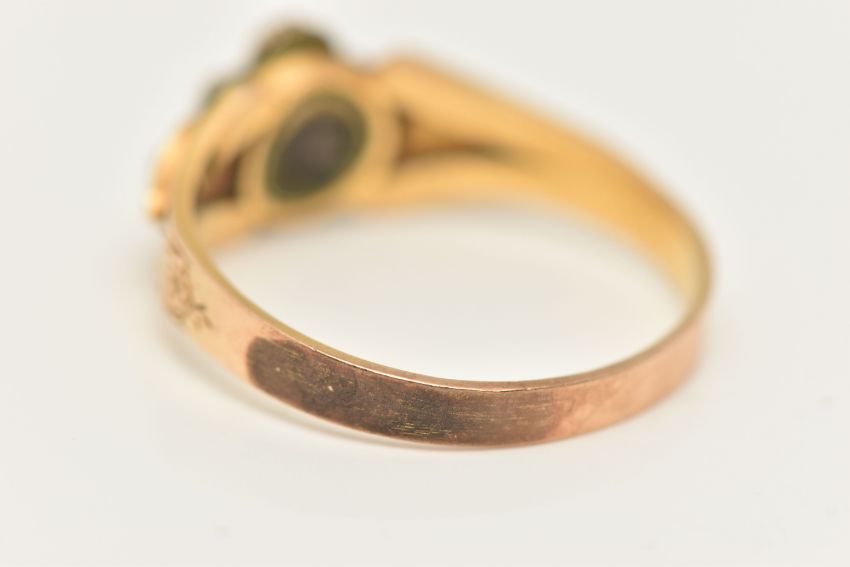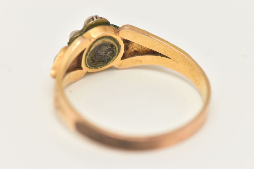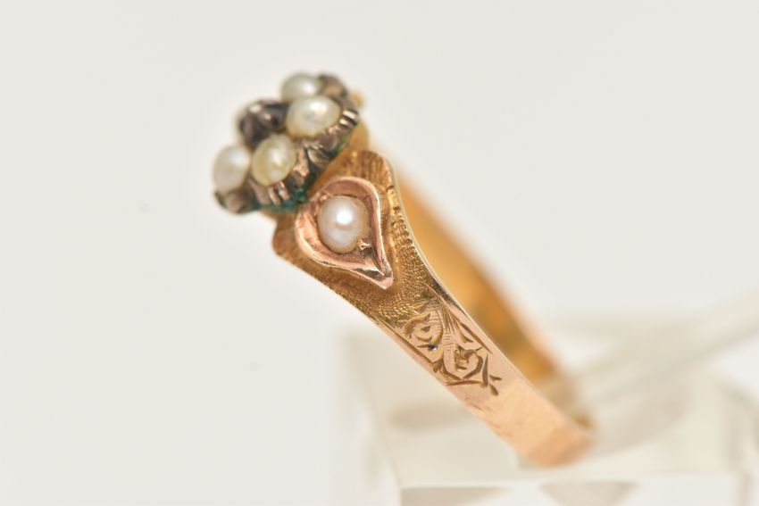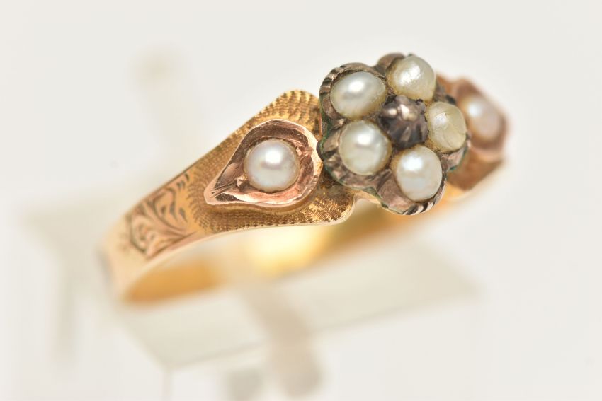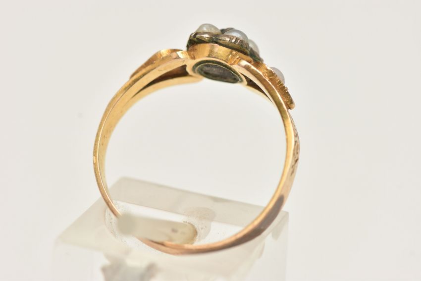 A YELLOW METAL SPLIT PEARL AND DIAMOND MEMORIAL RING, designed as a flower set with a very small central diamond chip, within a surround of split pearls, and split pearl set shoulders with textured surround leading onto a polished band, small compartment set with woven brown hair, missing glazed cover, unmarked metal, ring size O, approximate gross weight 2.6 grams (condition report: will benefit from a gentle clean and some attention, glazed cover is missing with dirt build up on the hair, patch of discolouration to the outer band, possible previous acid test)