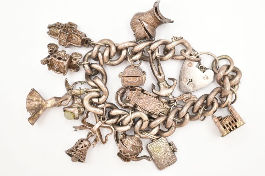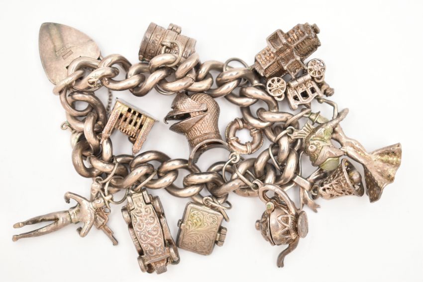 A SILVER CHARM BRACELET, a large curb link chain bracelet, fitted with a heart padlock clasp, hallmarked Birmingham, fitted with fourteen white metal charms, approximate gross weight 117.1 grams (condition report: general moderate wear, overall condition good)