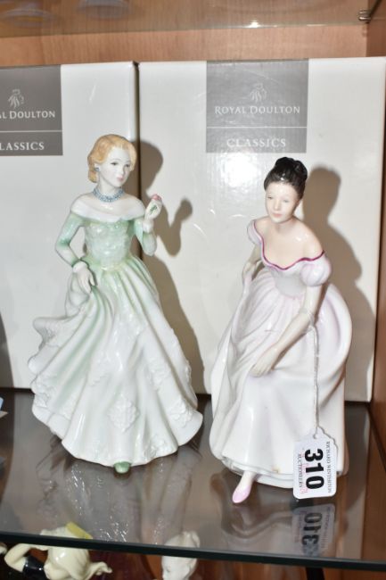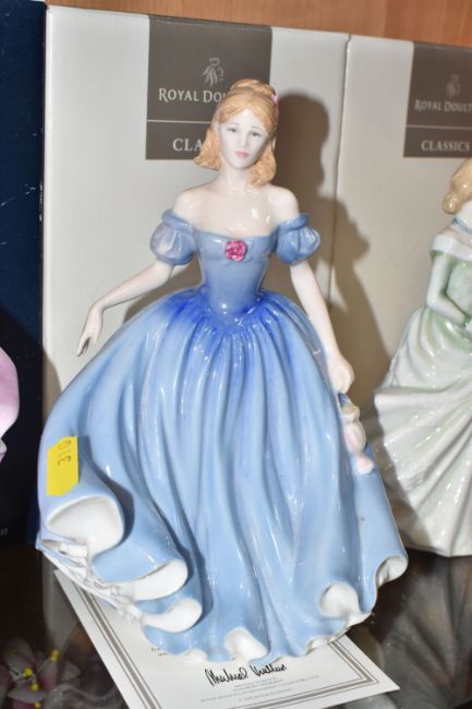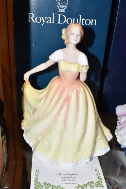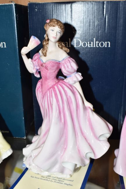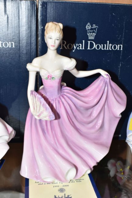 A GROUP OF SIX BOXED ROYAL DOULTON FIGURINES to include 'Danielle' HN3001 (evidence of writing to the base), 'Grace' HN3699 (evidence of UV writing and stickers to the base), a 'Figure of the Year 2001 Melissa' HN3977 (to include certificate of authenticity), 'Figure of the Year 2000 Rachel' HN3976 (to include certificate of authenticity), 'Figure of the Year 1999' HN3975 (to include certificate of authenticity), and 'Figure of the Year 1995 Deborah' HN3644 (dirt to the neck line) (6) (Condition Report: all itemised reports listed in the main description, all a little dusty, scuffs to the base)