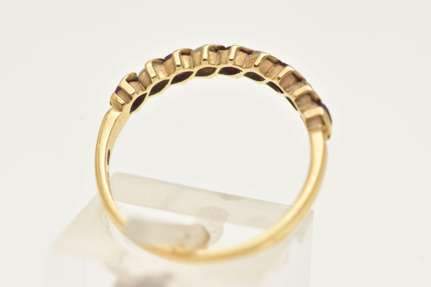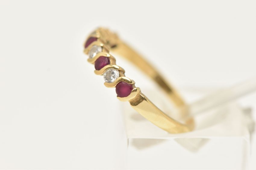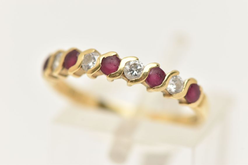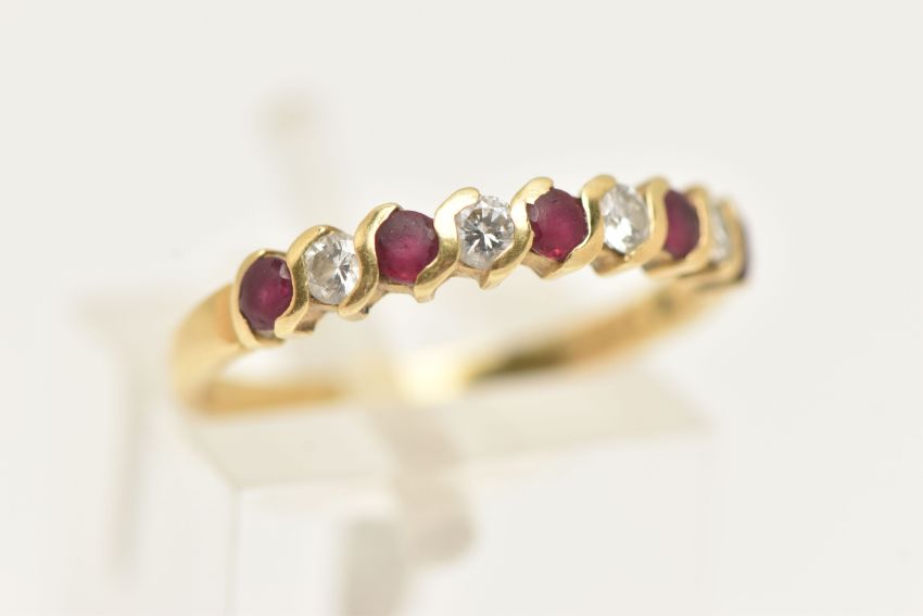 AN 18CT GOLD RUBY AND DIAMOND HALF ETERNITY RING, set with a row of five circular cut rubies interspaced with four round brilliant cut diamonds, shared settings leading onto a polished band, hallmarked 18ct London, ring size l 1/2, approximate gross weight 2.0 grams (condition report: rubies are very worn and abraded, would benefit from some attention, stones secure at time of cataloguing, general light wear)
