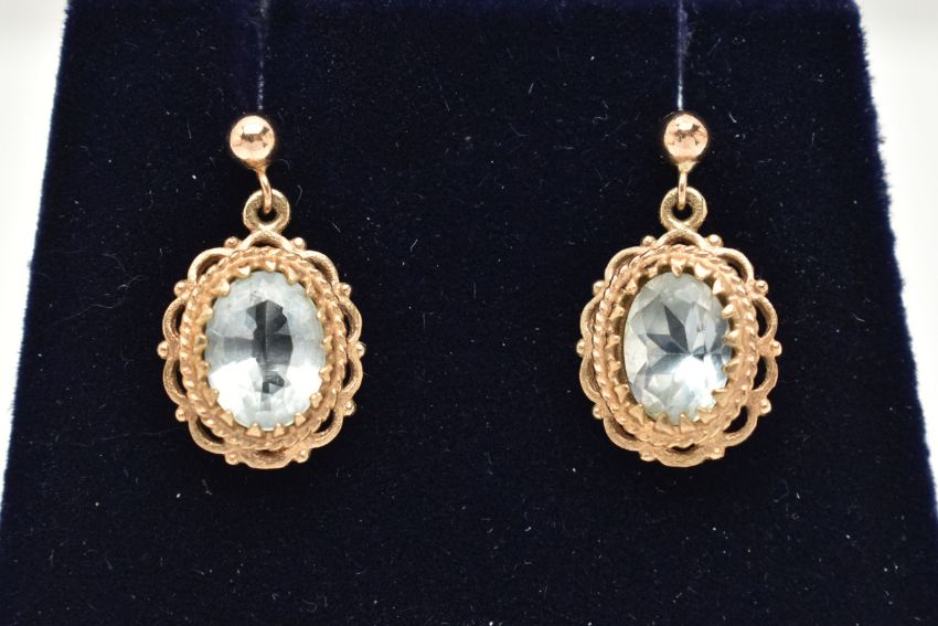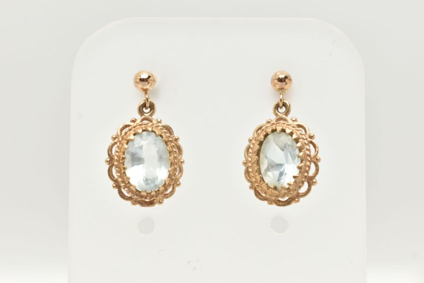 A PAIR OF YELLOW METAL GEM SET EARRINGS, oval cut light blue topaz, prong set in yellow metal with scalloped detail surround, fitted with post and scroll fittings, unmarked, approximate gross weight 2.2 grams, (condition report: general moderate wear, one tone is loose in setting, attention required)