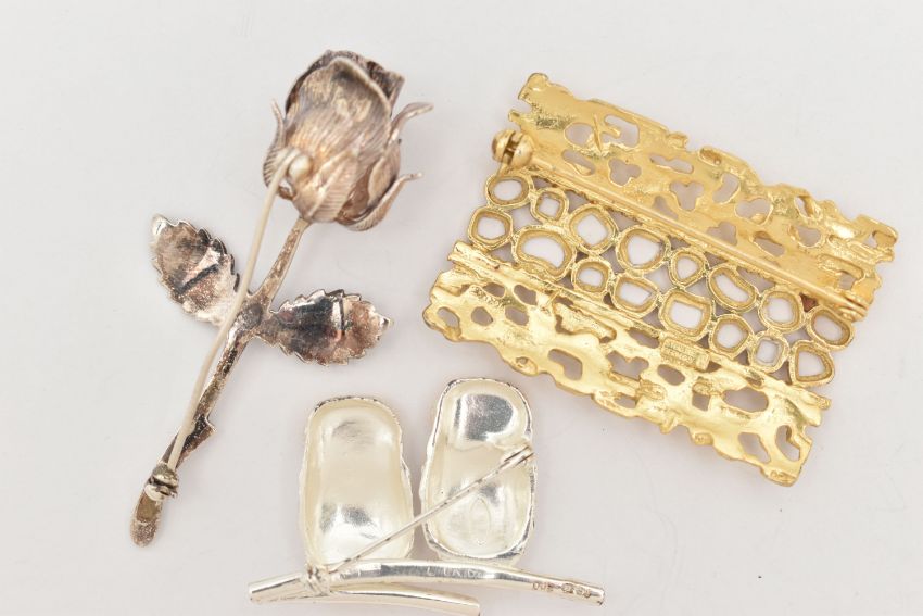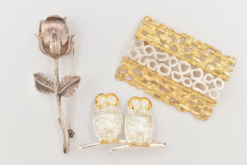 THREE BROOCHES, the first a silver brooch designed as two owls, with gold plated detail, hallmarked London import, approximate gross weight 8.2 grams, a bi colour brutalist style brooch, stamped sterling Germany, approximate gross weight 10.6 grams, together with a white metal rose brooch, unmarked, approximate gross weight 7.8 grams, (condition report: general light wear, overall condition good)
