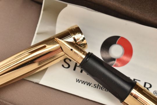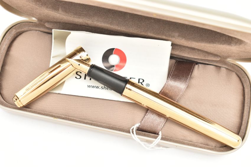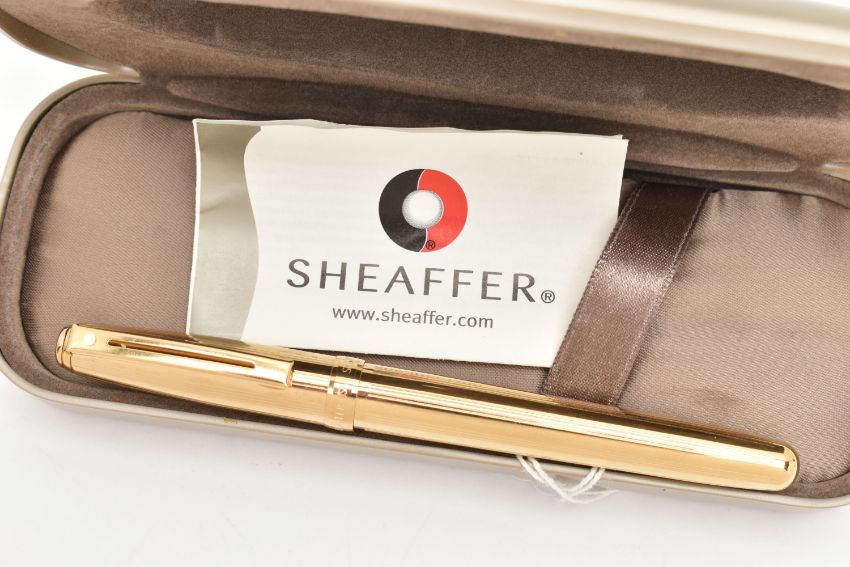 A 'SHEAFFER' FOUNTAIN PEN, a gold plated fountain pen signed 'Sheaffer', together with signed case and ink refills, (condition report: pen has not been tested for working condition)