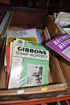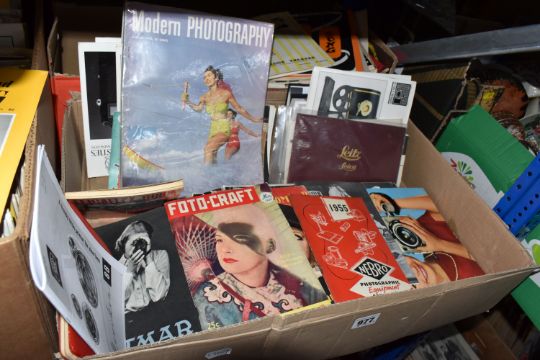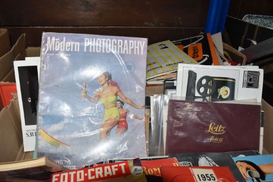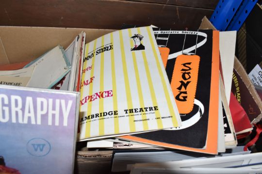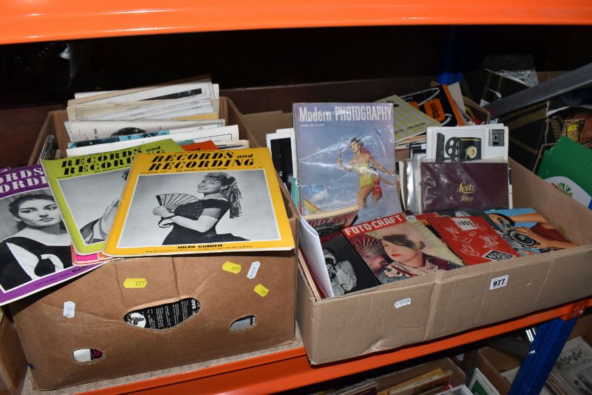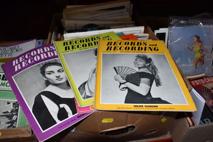 FOUR BOXES OF EARLY AND MID TWENTIETH CENTURY MAGAZINES AND BROCHURES, to include a large collection of 1950's 'Records and Recording' magazines, a large collection of amateur operatic society and musical theatre programmes dating from 1950s through to 1980s, a collection of camera and photographic brochures, catalogues and instruction booklets to include Leica and Zeiss Ikon, together with 1930's and 1960's 'Gibbons Stamp Monthly' magazines, etc. (s.d) (4 boxes)