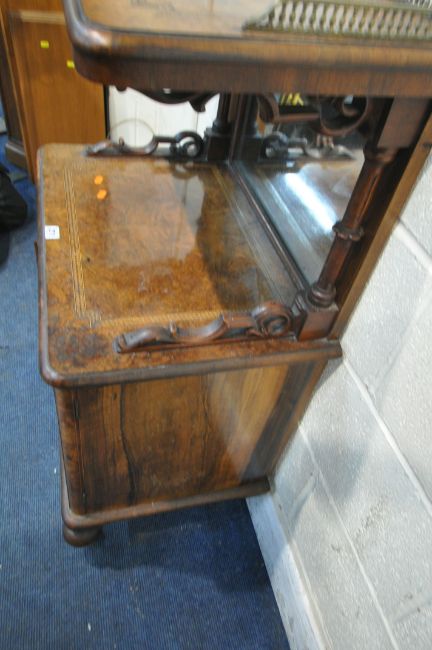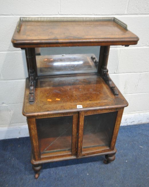 A VICTORIAN BURR WALNUT CABINET, with a brass gallery, mirror plate, above double glass doors, raised on turned legs, with castors, width 66cm x depth 44cm x height 107cm, condition report: missing one rear leg, historical marks, scuffs, other wear and usage