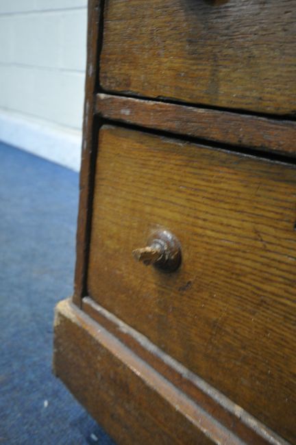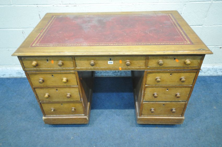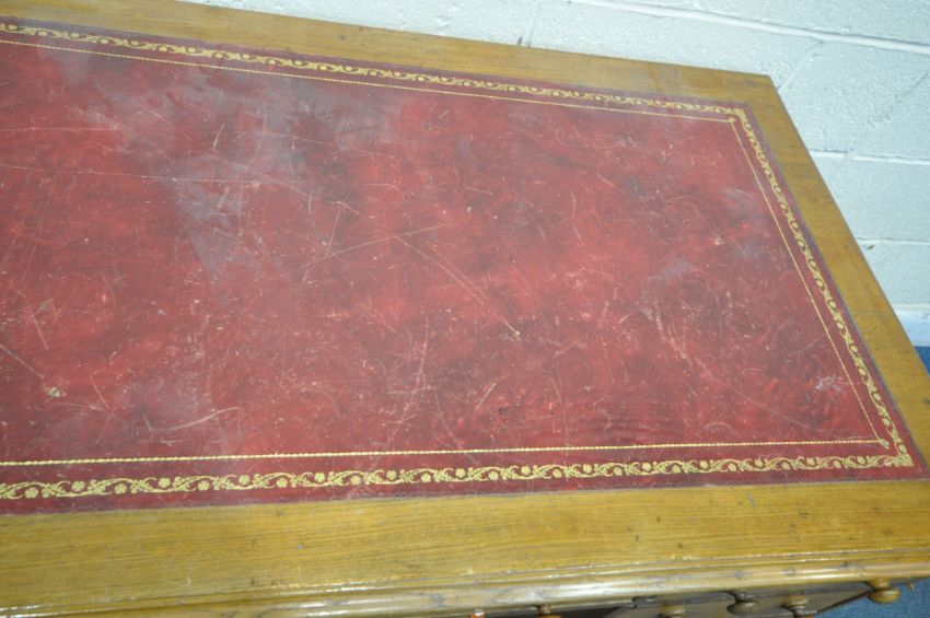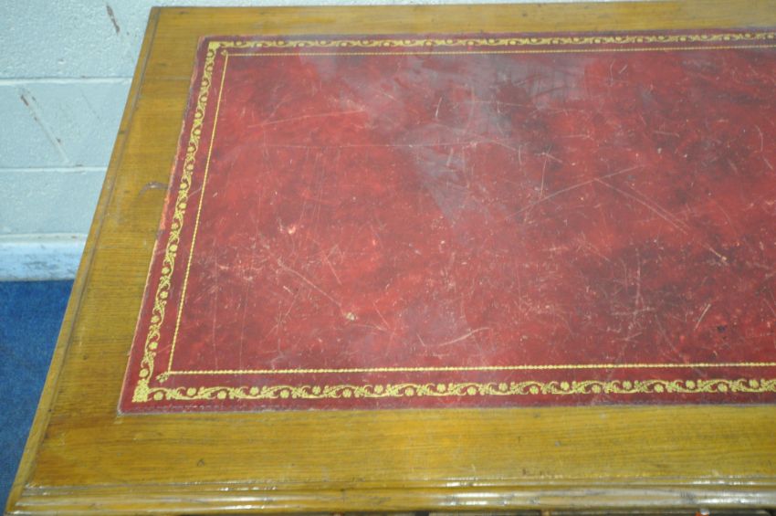 A 20TH CENTURY OAK TWIN PEDESTAL DESK, with an oxblood leather writing surface, fitted with nine assorted drawers, raised on later castors, width 123cm x depth 74cm x height 79cm, condition report: marks, scuffs, stains, scratches, losses, other wear and usage