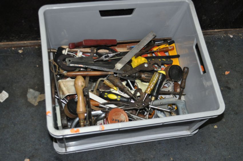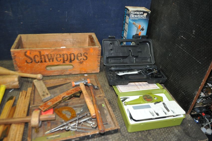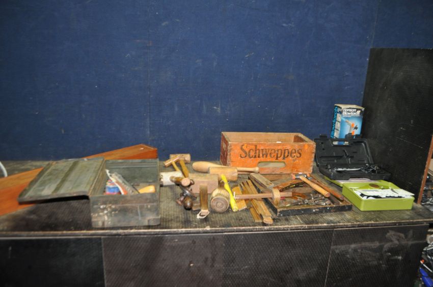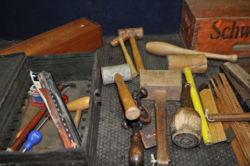 A TRAY, A WOODEN CRATE, A METAL BOX CONTAINING TOOLS including three hide mallets, carving mallets, joiners, rules, hammers, a nylon mallet, dividers, calipers, spirit levels etc