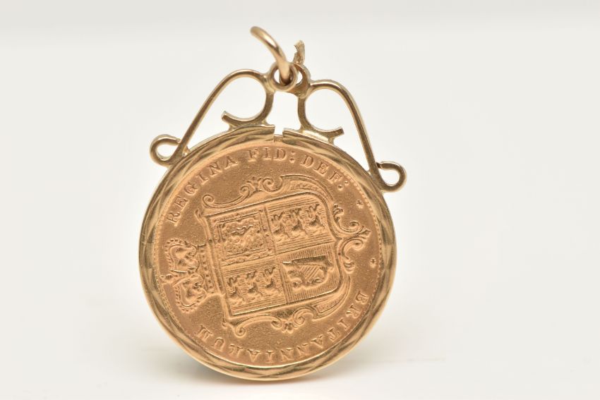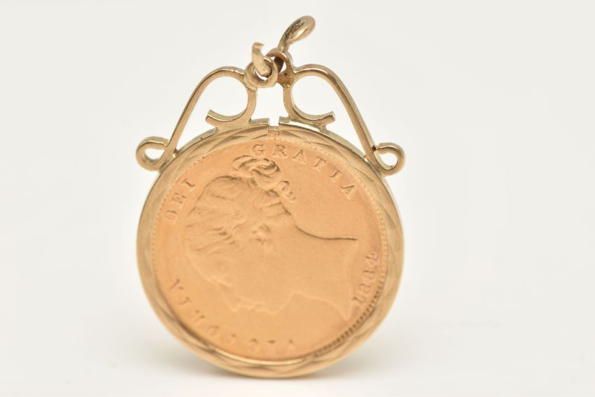 A MOUNTED VICTORIAN SHEILD BACK HALF SOVEREIGN COIN, depicting young Queen Victoria dated 1884, within a textured collet mount with scrolling surmount and split jump ring, mount hallmarked 9ct London, approximate diameter 20.1mm, approximate gross weight 5.3 grams (condition report: general light wear)