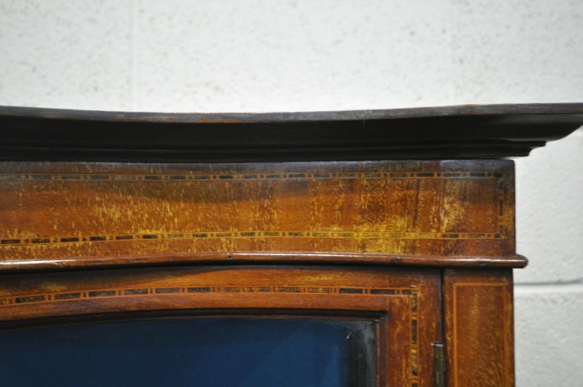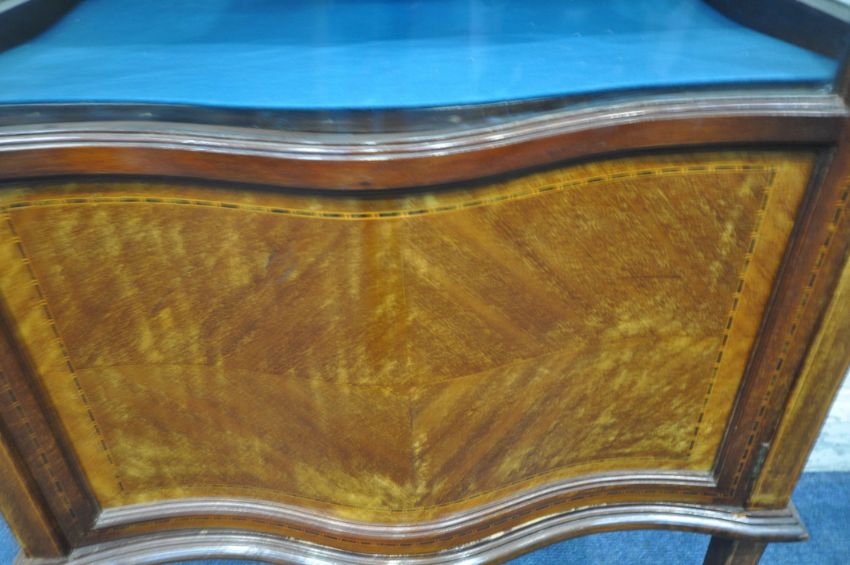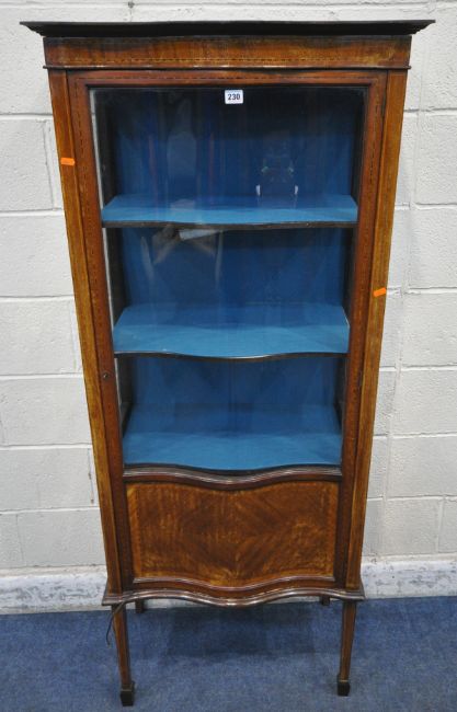 A 20TH CENTURY MAHOGANY SERPENTINE DISPLAY CABINET, the single drawer enclosing three shelves, raised on square tapered legs, width 70cm x depth 41cm x height 169cm, condition report: one key, surface marks, scuffs, discolouration, other wear and usage