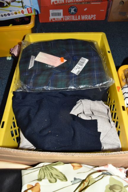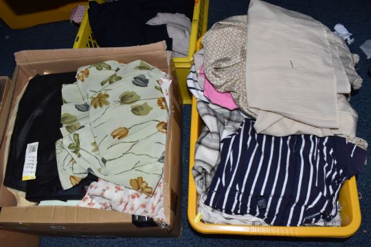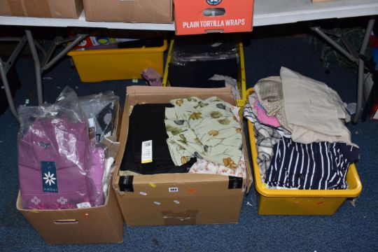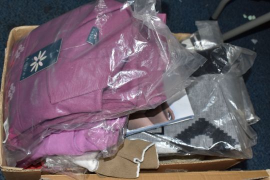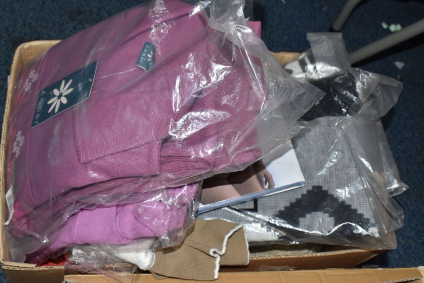 SIX BOXES OF WOMEN'S CLOTHES to include a variety of high street clothes comprising unopened jumpers and fleeces, unopened Marks and Spencer's underwear, unopened compression socks, a quantity of floral skirts, an unused pair of artificial leather Marks and Spencer's trousers, a variety of assorted tops and blouses, two unopened pairs of Close Things pyjamas, most items are waist size 14-16, and tops 16-8 (6 boxes) (s.d)