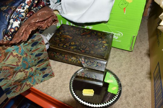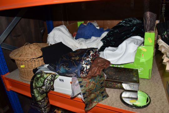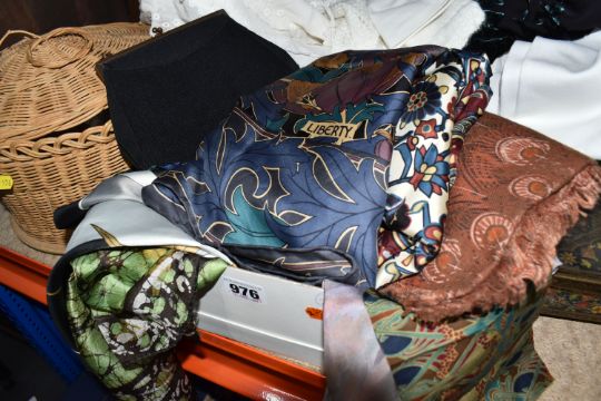 TWO BOXES AND LOOSE LACE AND EMBROIDERED TABLE LINEN, SILK SCARVES AND SUNDRIES, to include an early 20th century lidded wicker sewing basket, two small circular wall /table mirrors, a small vintage 'C.W.S Biscuits' tin, a teal, gold and purple silk scarf by 'Liberty' of London, small pieces of patterned fabric, table linen and lace, a small black crepe evening bag, etc. (s.d/a.f)
