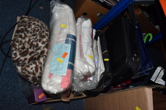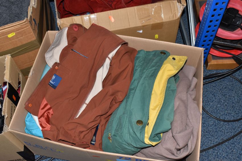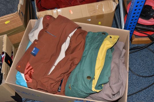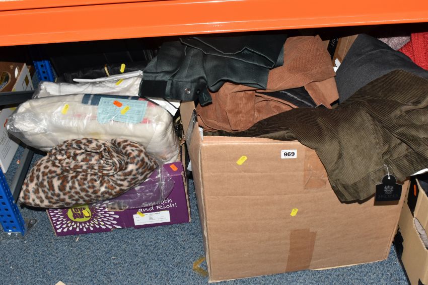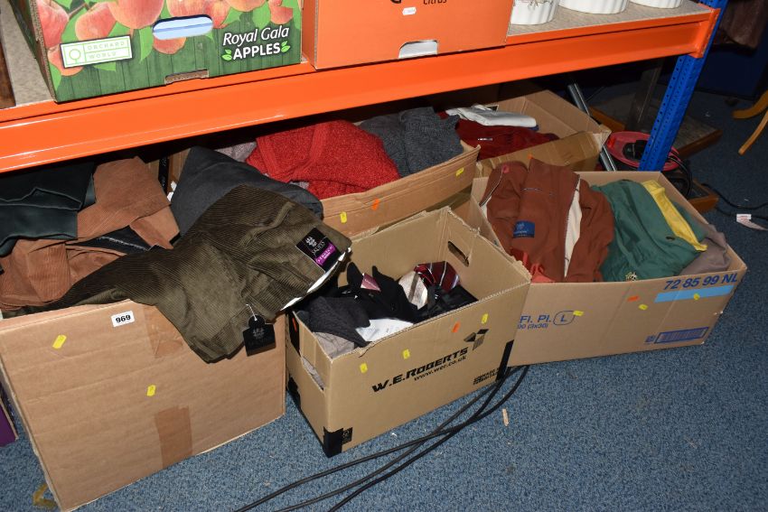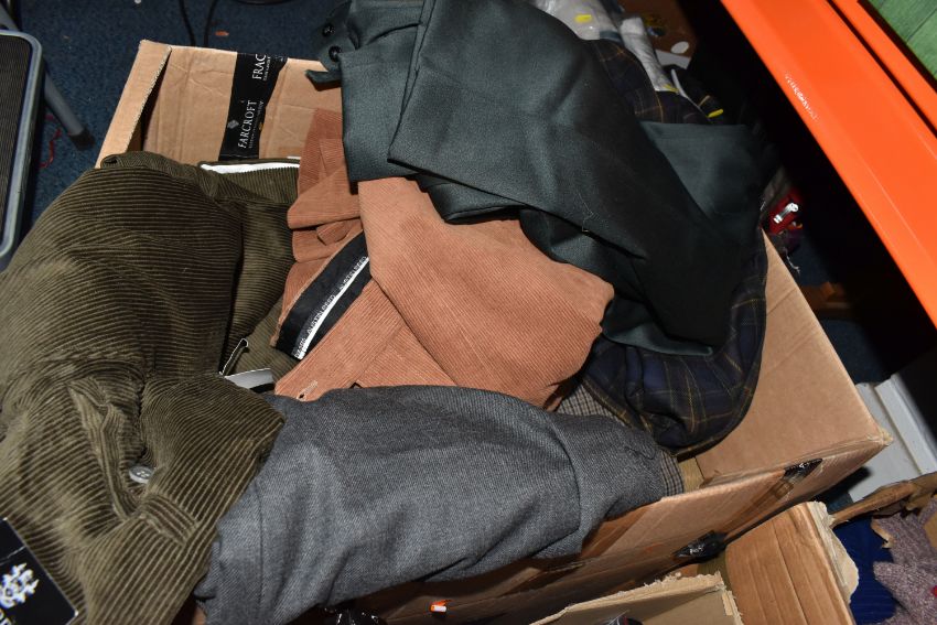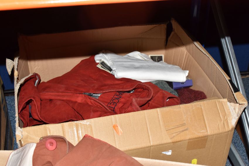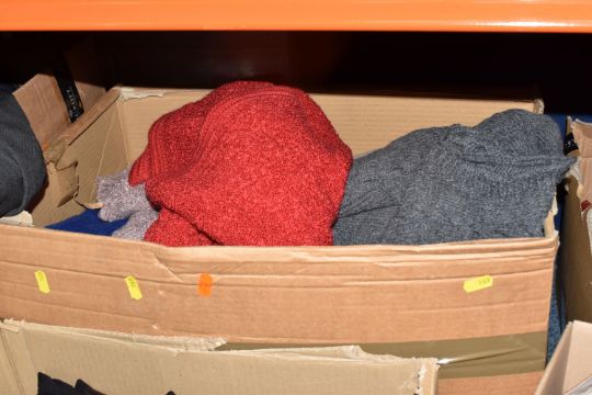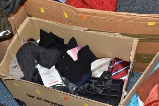 SIX BOXES OF MEN'S AND WOMEN'S CLOTHING, to include sweaters, neck ties, trousers, jackets, unused woollen socks with shop labels, corduroy trousers, maker's names include Austin Reed, Skopes, etc. men's UK waist size 38R, ladies UK size 14, some men's trousers are unused with shop labels attached, signs of wear to some sweaters, together with a nylon laptop bag, table linen and packaged throws (s.d/a.f) (6 boxes)