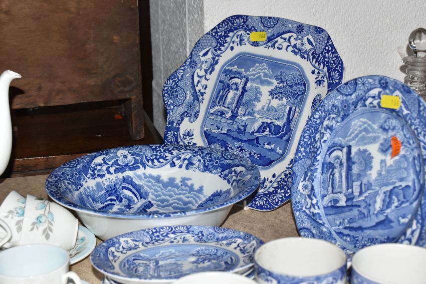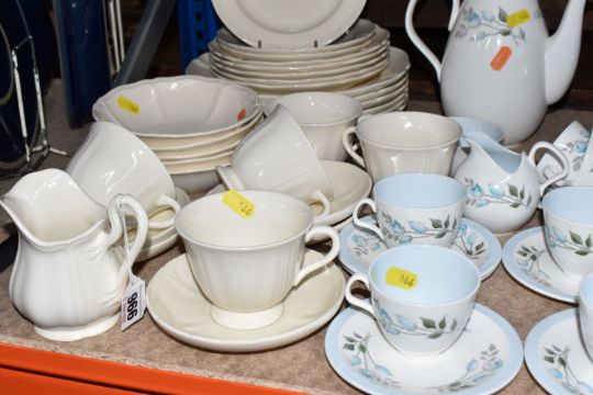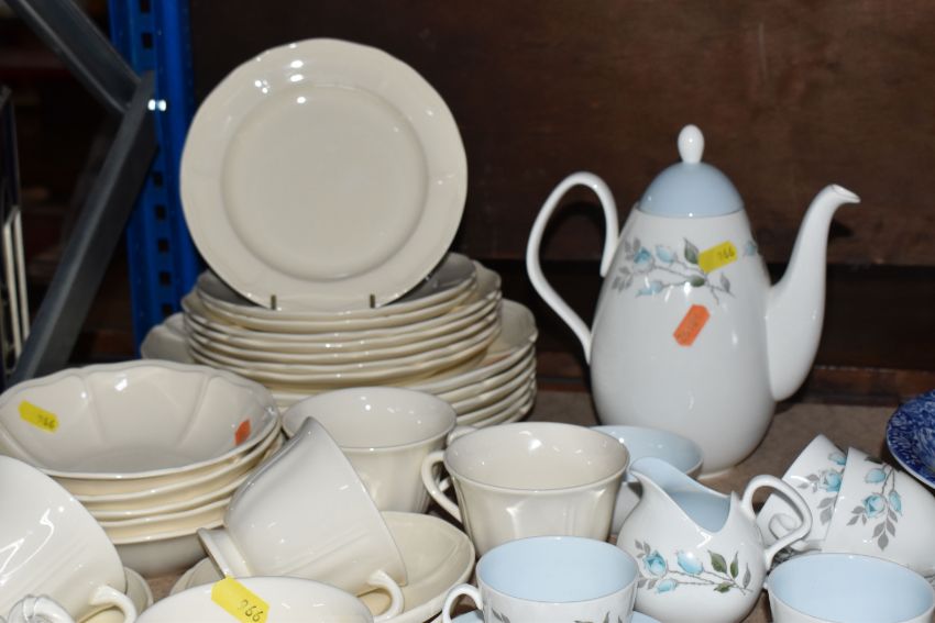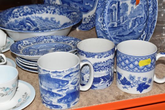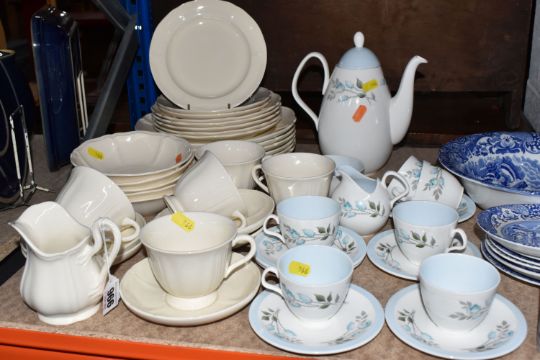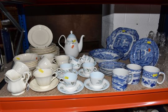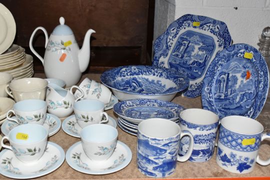 A GROUP OF TEA AND DINNERWARE, comprising a Wedgwood Queen's shape 'Queens Plain' part dinner set of six dinner plates, five starter plates, three side plates, five dishes, five tea cups, five saucers and one milk jug (30), a Foley bone china 'Dusk Rose' pattern coffee set comprising coffee pot, cream jug, sugar bowl, six cups, six saucers (15), together with a collection of blue and white Copeland Spode 'Spode's Italian' pattern comprising a square cake plate, side plate, large serving dish, bread plate, five assorted size saucers (one broken in half/reglued), and three 'The Spode Blue room Collection ' mugs (12) (57 in total) (Condition Report: in need of a wash, most obvious damage is mentioned in description)
