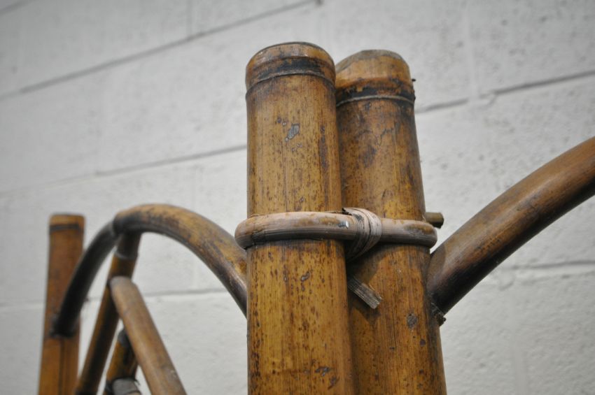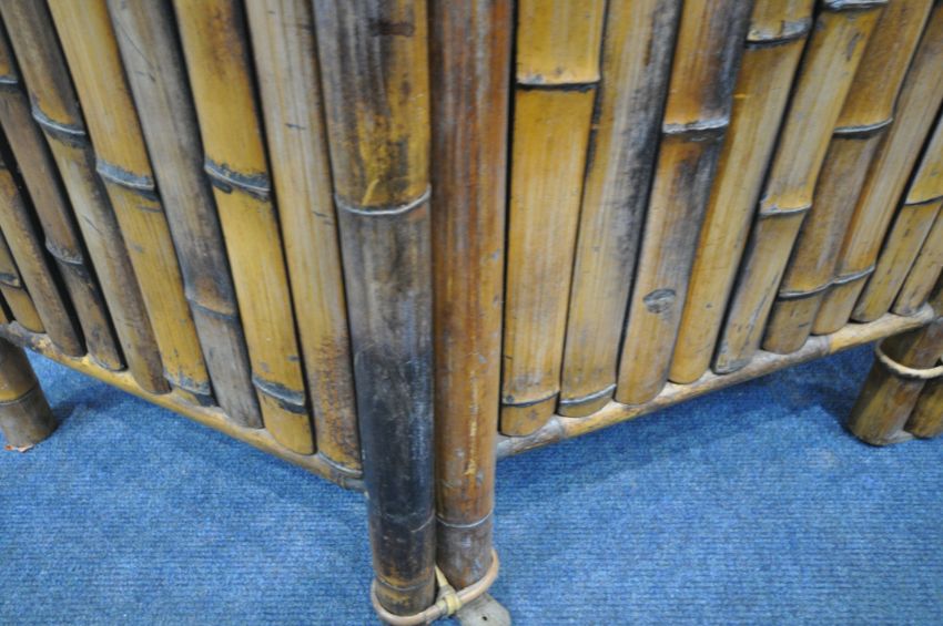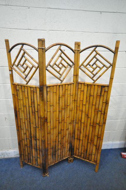 A THREE PANEL BAMBOO FOLDING SCREEN, each with geometric designs to the top, overall width 131cm x single panel width 44cm x height 183cm, condition report: general signs of wear and usage